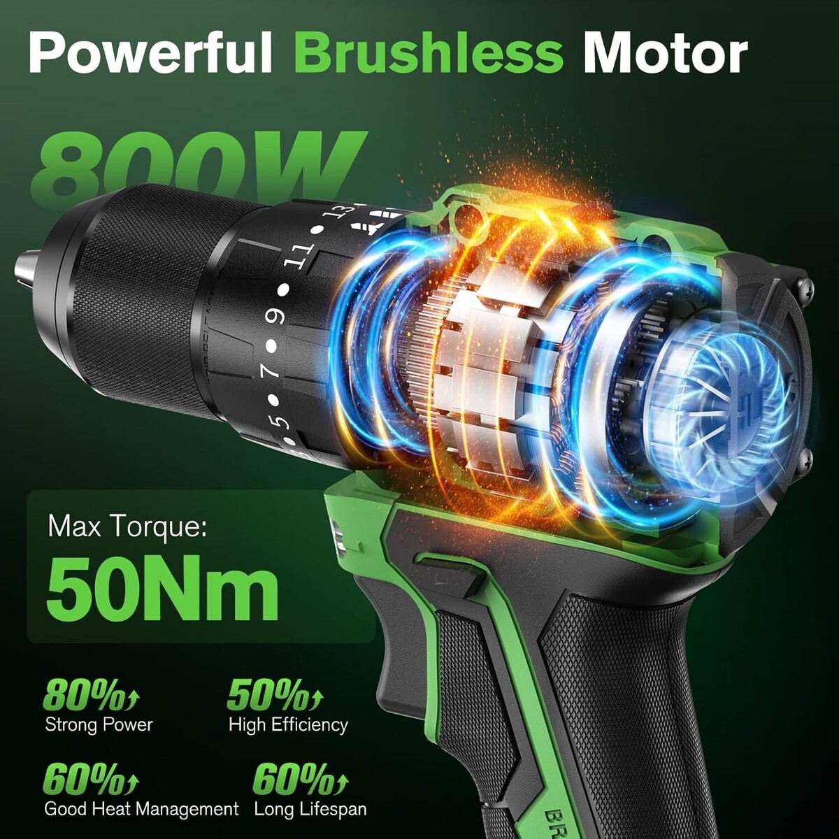 Features: Compact,Lightweight,Brushless Motor,Adjustable Torque,Cordless,Adjustable Mode,Keyless Chuck,Ergonomic design,Built-in LED light,Battery level indicator