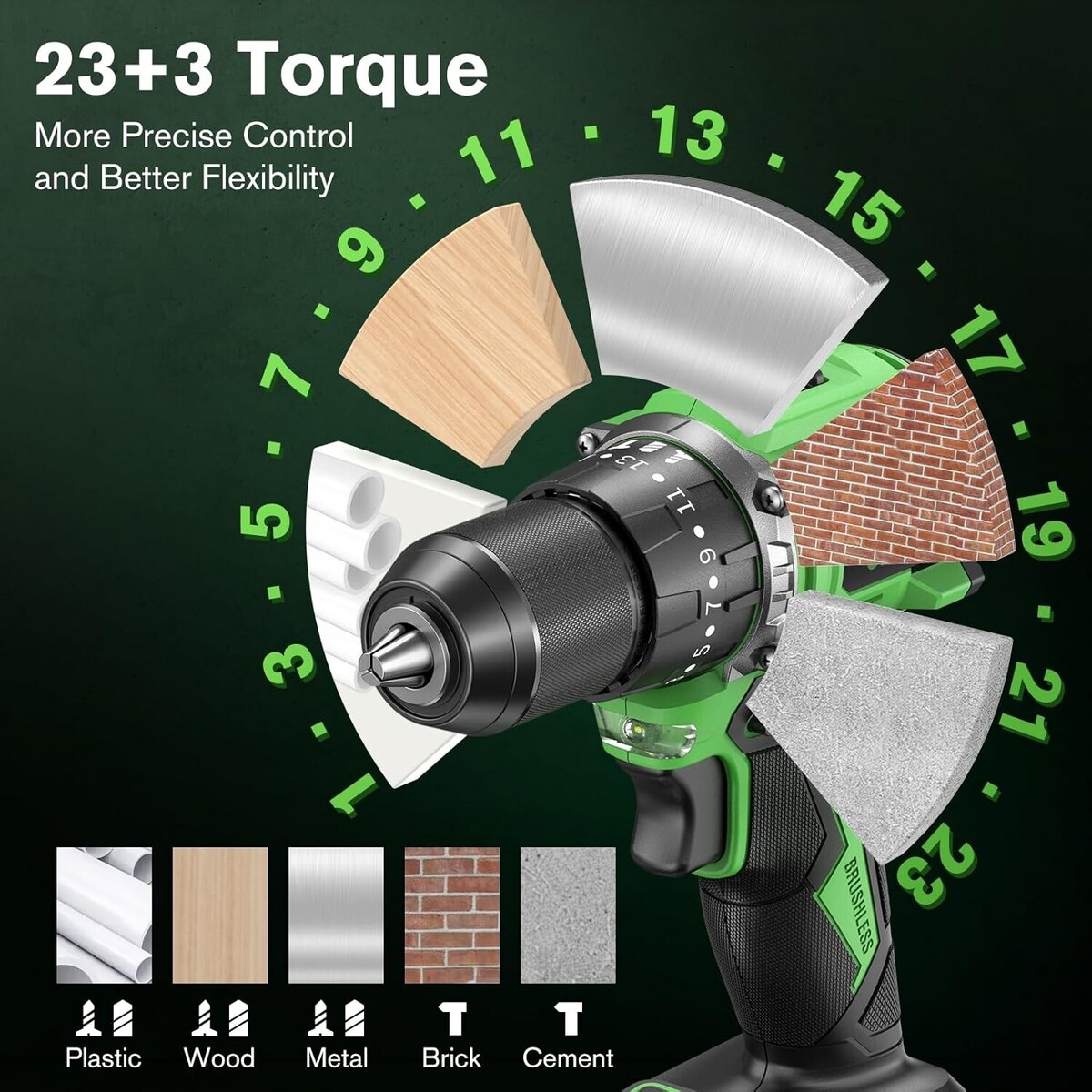 23+3 Position Clutch: With 23+3 torque settings (50 Nm Max) and multiple modes including screwdriving, drilling, and impact drilling, gain precise control to protect materials from over-tightening.