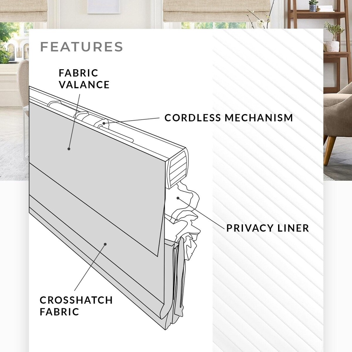 Roman Shade - Crafted with a symmetric cross-hatched fabric, supported by a fabric valance in front and a white liner behind