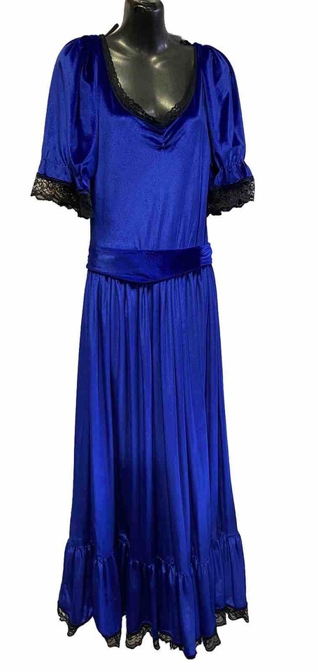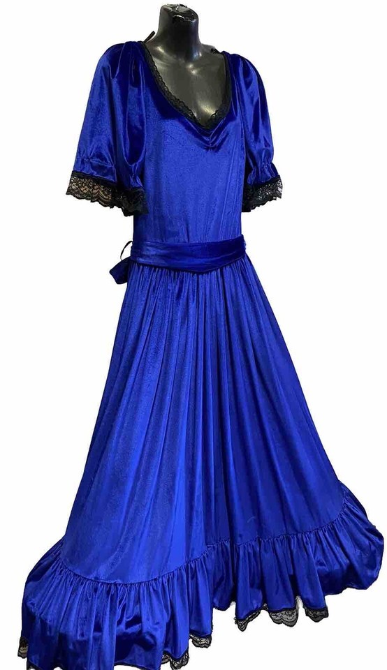 Blue velvet gown that can be worn with or without a hooped underskirt . The dress has a matching belt and is edged in black lace