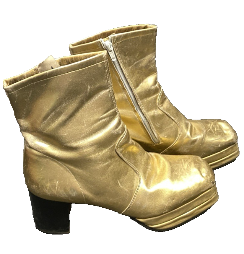 Gold Lame with wooden platform heels , zip sides The product is a pair of 70's platform boots in size 7 for men. These stylish boots are perfect for adding a retro touch to any outfit, whether you're dressing up for a fancy event or simply want to add a bit of vintage flair to your everyday look. With a platform sole and a UK size 7, these boots are both comfortable and on-trend, making them a must-have accessory for the modern gentleman.