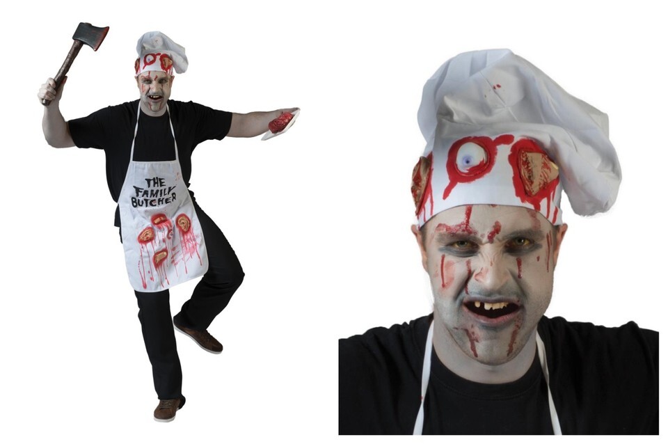 "The Family Butcher" is a chilling horror-inspired costume, perfect for Halloween or themed events. The white chef outfit includes body parts as embellishments, adding a gruesome touch to the overall look. Made from polyester, this unisex fancy dress is designed to fit a regular size and complete the terrifying theme of the character. Perfect for those looking to make a statement and scare their friends and family at their next costume party or event."