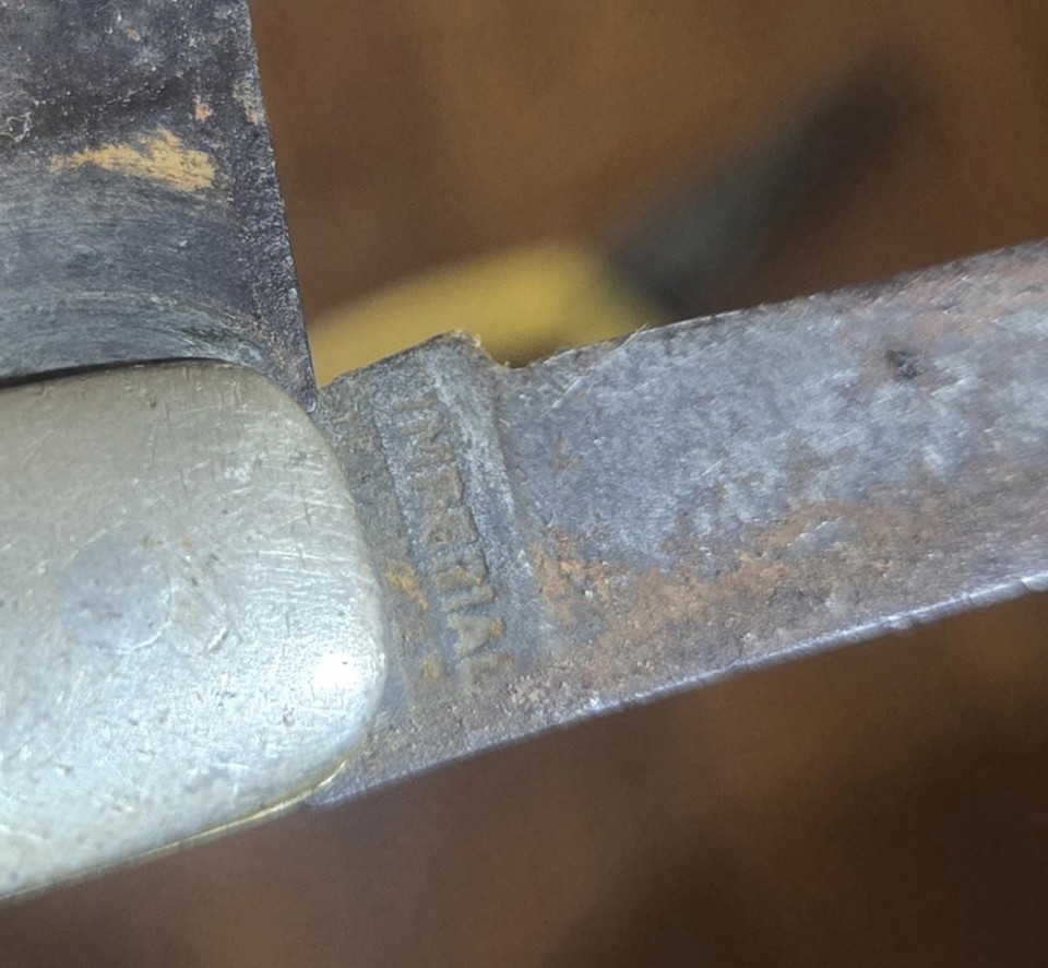This is a vintage folding pocket knife with a textured handle and metal bolsters.