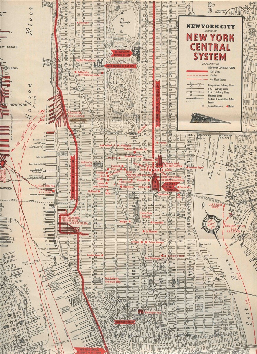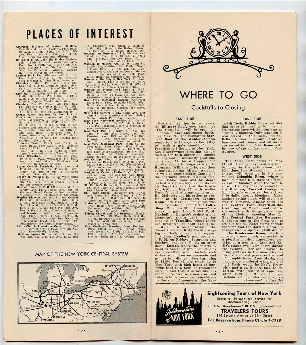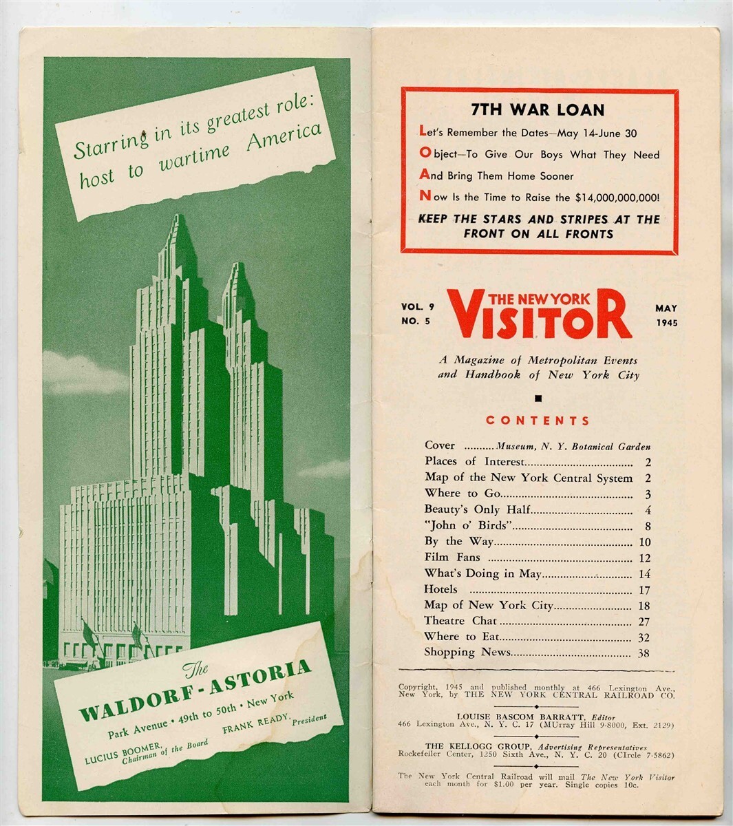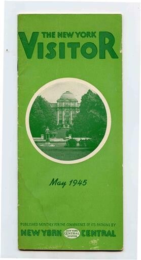 A 43 page booklet in soft cover. Has large fold out map, lots of information for visitors, advertising, and more. The New York Visitor from May 1945, published monthly for the convenience of Patrons by New York Central Railroad