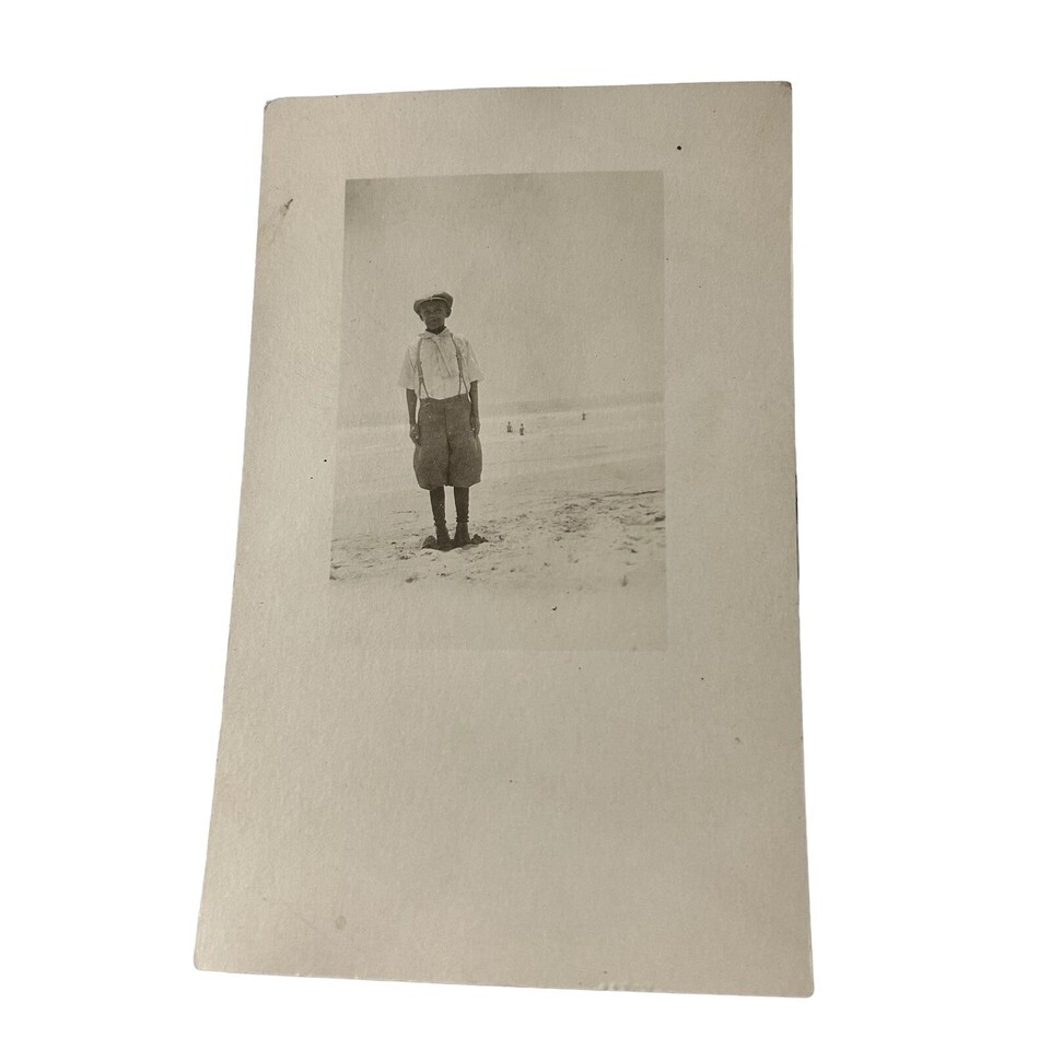 1900's RPPC Boy w/Suspenders Shorts Hat Standing on Sand on Beach w/Ocean Behind Unused...