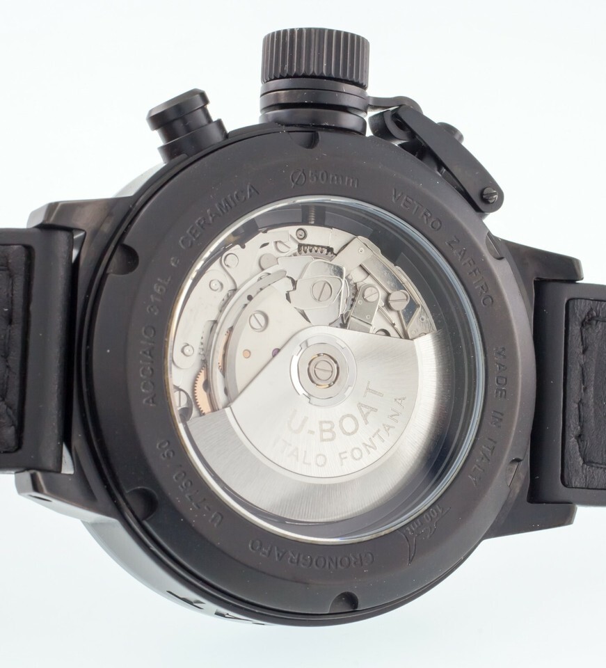 Reverse Engraved "U-7750/50, ACCIAIO 316L CERAMICA, 50 mm, VETRO ZAFFIRO, MADE IN ITALY, 100 mt, CRONOGRAFO"