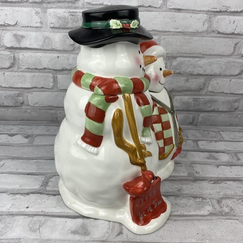 Snowman Couple Duo Cookie Jar Christmas Holiday Winter 11.5 Inches Tall