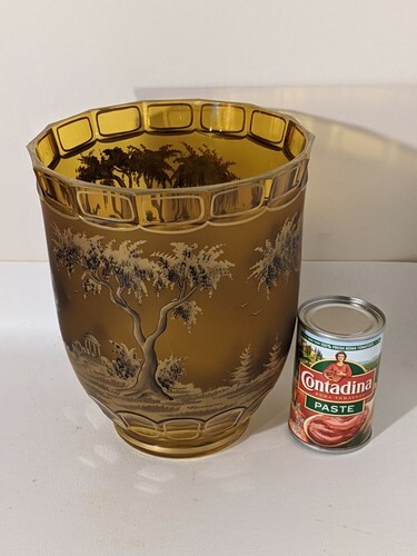 1950 West Germany Painted Colonial Figures Amber Crystal Vase Signed 8 inch
