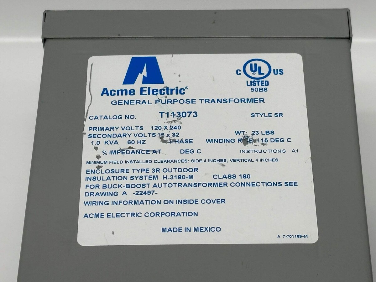 Acme T113073 General Purpose Single-Phase Transformer 1 kVA 120/240V New - No Original Box The Acme T113073 is a single-phase general purpose transformer rated at 1 kVA and designed for reliable voltage conversion in a wide range of commercial and industrial applications. It operates with a 120/240 VAC primary and a 16/32 VAC secondary, making it suitable for control circuits, lighting systems, and other low-voltage equipment. This transformer features copper windings and an encapsulated core construction that enhances durability while reducing noise and heat during operation. Its compact, wall-mountable design allows for easy installation in electrical rooms, panels, or machinery enclosures. Listed by: Richard (Sales Team) ?Mistakes are part of the dues that we pay on the pathways that lie ahead? RRW (A positive moment brought to you by Help Resale) About Us Welcome to Help Resale, your go-to consignment shop where value meets quality. At Help Resale, we're dedicated to providing you with an exceptional shopping experience, whether you're looking to find the best deals or consign your items. Need to buy a product, but don't see it in our store? Please feel free to reach out to us and we will help you find it! Help Resale 7200 Fair Oaks Blvd Suite 120 Carmichael CA 95608 Business Hours: Monday-Friday: 9:00 am to 5:00 pm (PST) All product and company names are trademarks TM or registered trademarks of their respective holders. Use of them does not imply any affiliation with or endorsement by them.