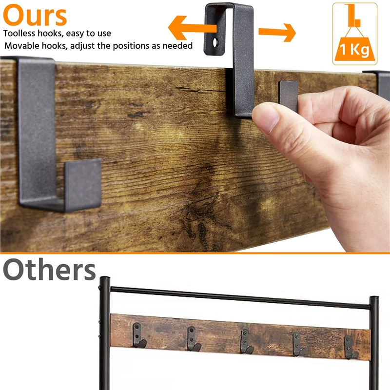 This multifunctional entryway coat rack is the perfect piece for any small space or narrow foyer. This functional Alden Design hall tree has 9 movable hooks for hats, coats, keys, dog leashes, etc. These 9 movable hooks can be placed anywhere on the hall tree. There are also 2 additional shoe storage shelves and 1 storage bench that provide a perfect space to change and store your shoes. The sturdy hall tree is built from high-quality materials and is guaranteed to last a long time. We have provided 2 anti-tip kits to secure the entryway coat rack to the wall. We have also provided 4 protective foot caps to place onto the base that helps prevent any damage to the floor. This simple, chic, rustic hall tree will blend in perfectly with any home decor style.