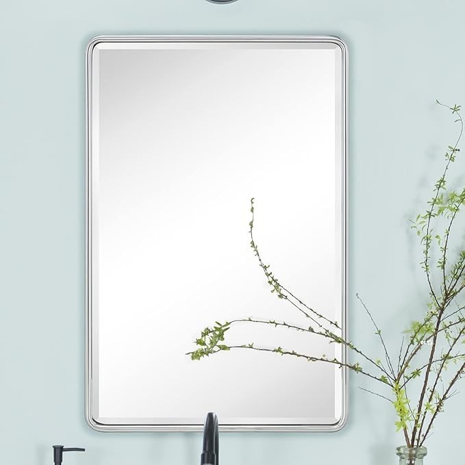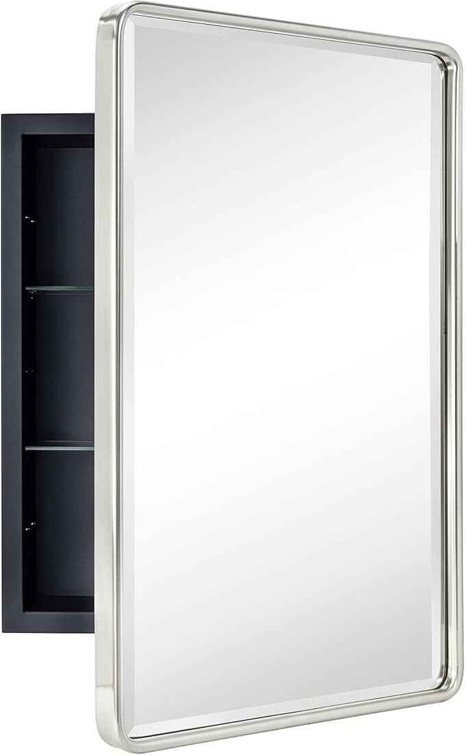 Metal Framed Medincine Cabinets: Premium metal door with PLATED brushed nickel finish, super moisture resistant and beautiful,framed with an elegantly beveled mirror. Door is coming with strong magnetic hinges.