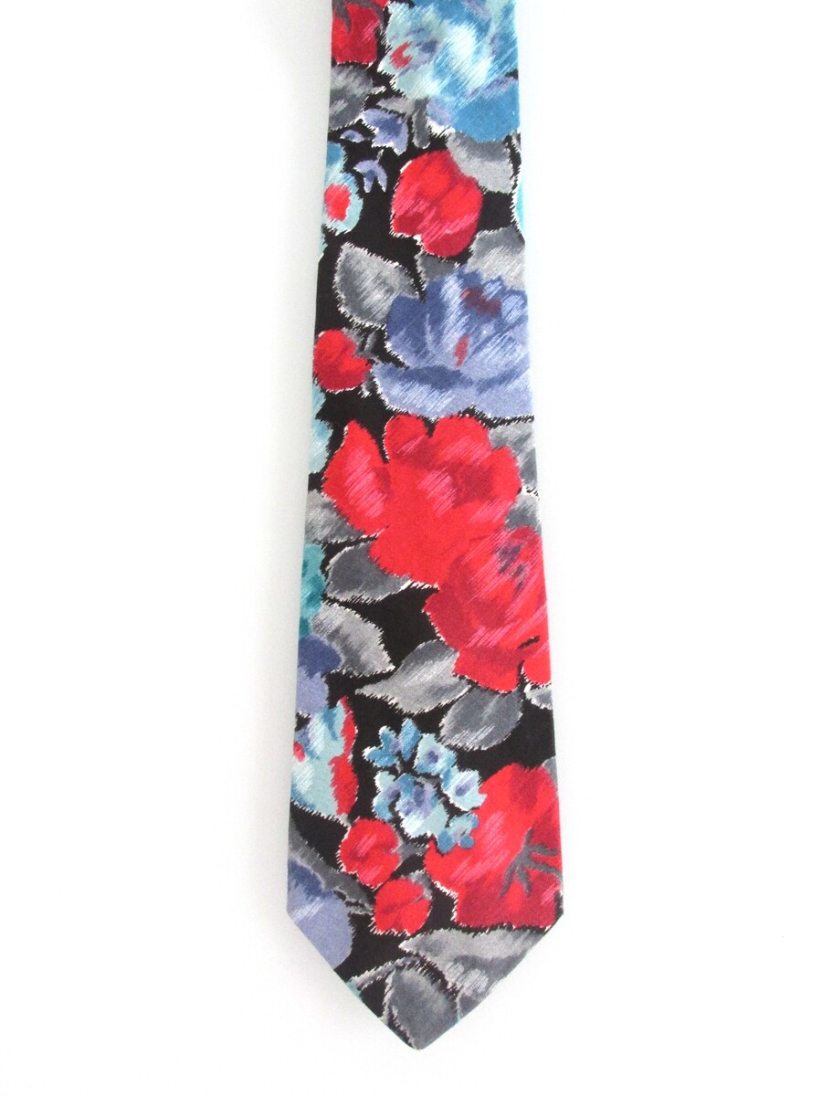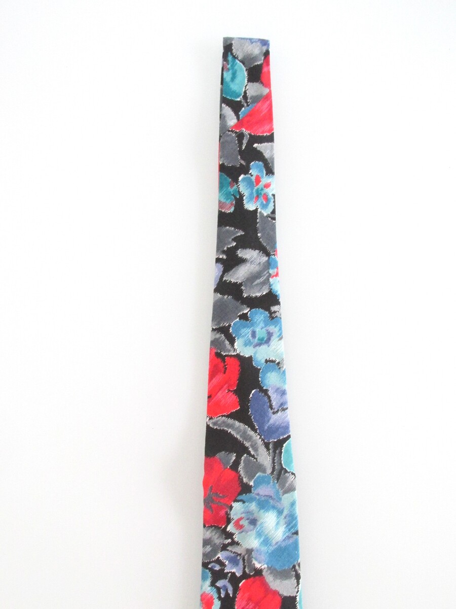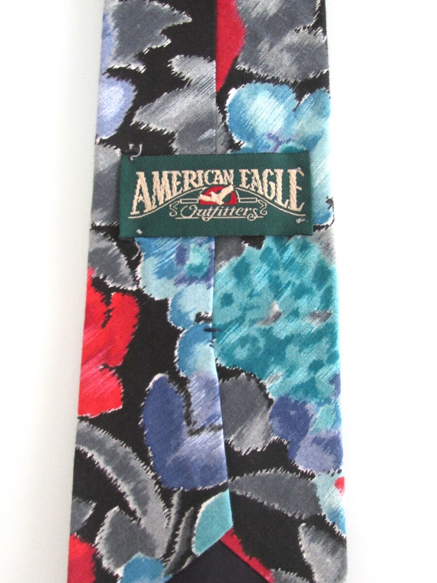 Description: Up for sale is an American Eagle Outfitters men's cotton tie. It is handmade of 100% cotton. The dimensions are approximately 56" long x 3.75" wide. The tie has a multicolored bold floral pattern in red, blue, lavender gray on a black background. This tie is in excellent condition.