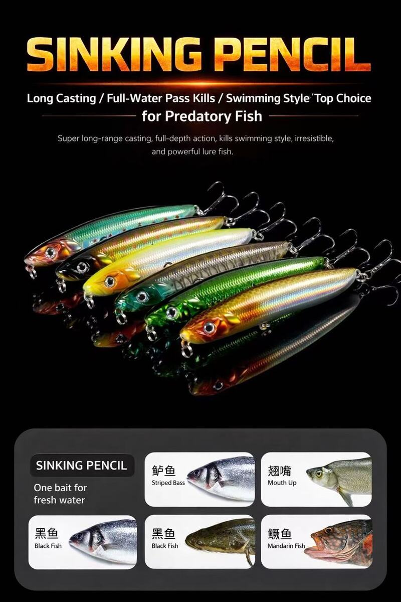 This sinking pencil fishing lure is designed to imitate an injured baitfish with a natural trembling swimming action, making it highly effective at attracting predatory fish.