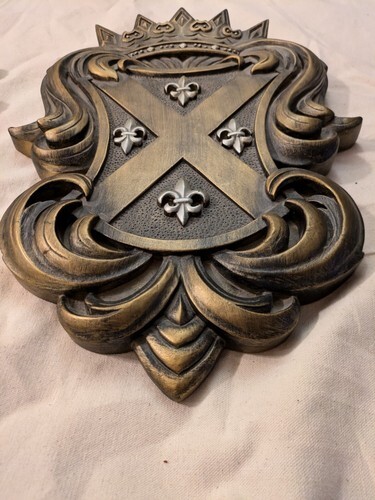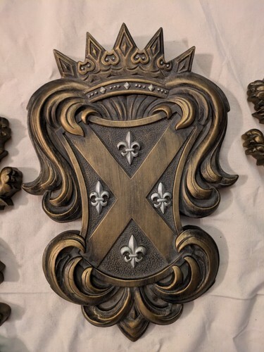 Add a touch of vintage charm to your space with this set of 3 chalkware wall art plaques that includes a left and right lion with a Crest.. The mid-century modern style and hand-painted details make these pieces unique additions to any collection. The coat of arms features a lion design, and the shield measurements are 20 x 13 inches. These wall art plaques were manufactured in the United States during the 1960s and are perfect for any collector of vintage or retro items. Make a statement in your space with these one-of-a-kind pieces.