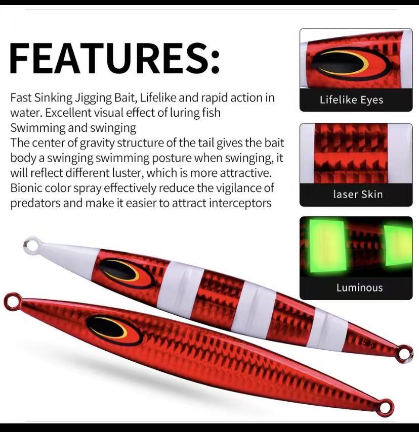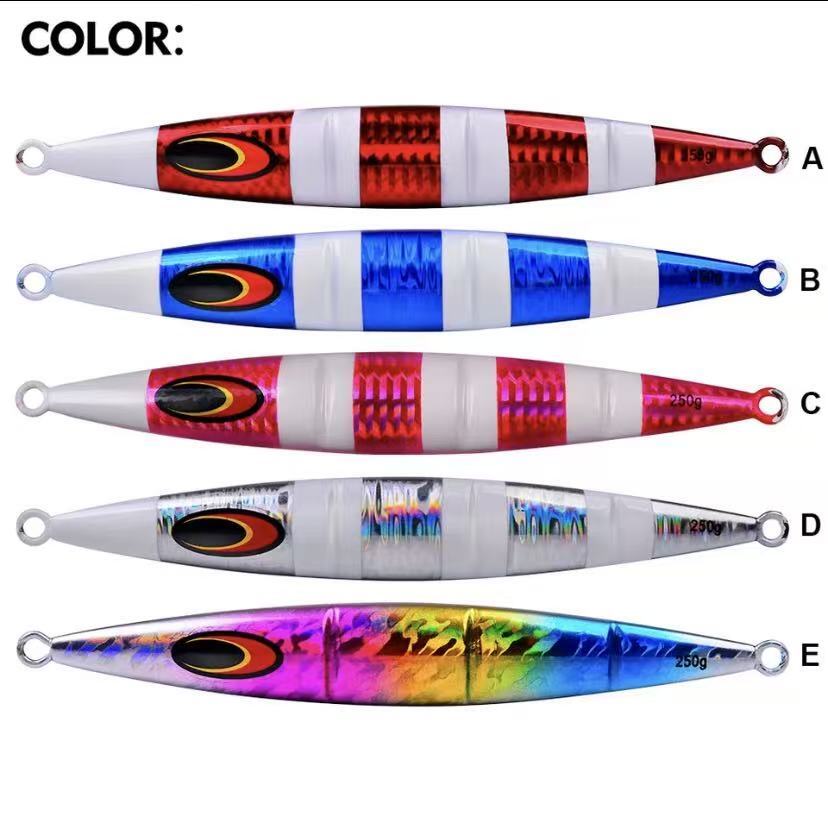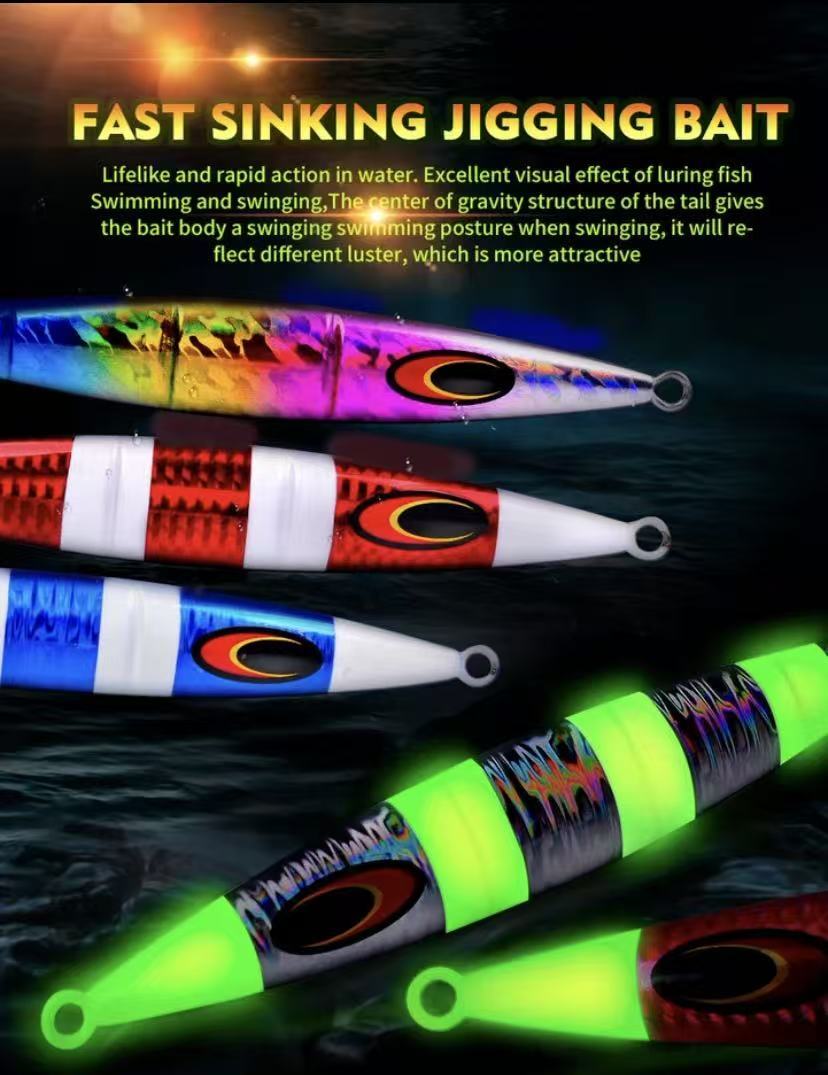 High-quality slow jigging metal lures with luminous coating and strong hooks, designed to trigger strikes in deep water and low-light conditions.