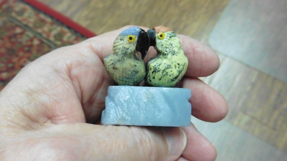 (internal #Y-BIR-PA-454) Excellent figurine of green serpentine DOUBLE/PAIR PARROTS on stone base. Handmade of NATURAL SOAPSTONE, 2" tall x 1-1/2" wide x 1-1/4" deep, made in Peru. Great for the bird/parrot collector!