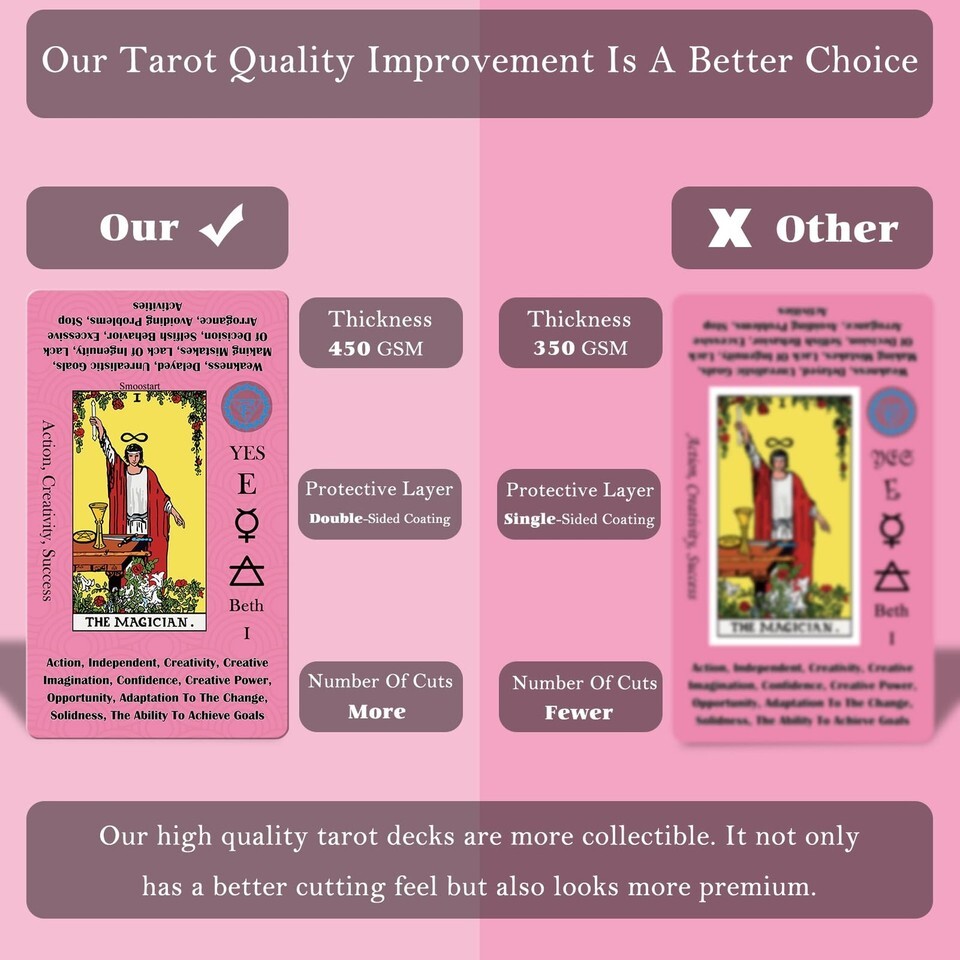 [Upgraded Material] - The paper used in our tarot is 450GSM. This is thicker than the common 350 GSM and 400 GSM tarot. This makes our tarot have better quality. Not only does it have a better cutting feel but it also has a more premium look and feel. It can be shuffled many times without deformation and damage.