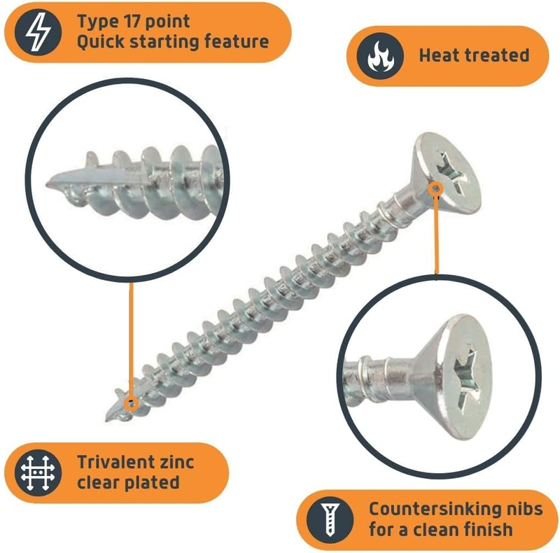 All of our screws are heat treated and trivalent zinc clear-plated, with a type 17 point for easy quick-start drilling. Fully threaded shank provides optimal retention, while countersinking nibs remove material for a clean finish.
