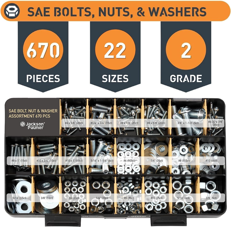 Our set includes Grade 2 SAE and Metric washers, nuts, and bolts. Grade 2 bolts have a high tensile strength, meaning that they can withstand a large amount of pull force. We include extras of the most commonly used washer sizes to ensure that you are covered for every single project.