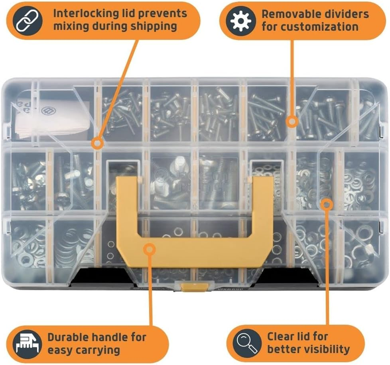 Looking for a set with every screw and size you can imagine? Look no further! Our hardware assortment is the perfect kit to keep on hand for DIY or home improvement projects. No more having to run to the store for that one extra piece of hardware! With 2,200 pieces in 62 different sizes, our kit is built for work and built to last.