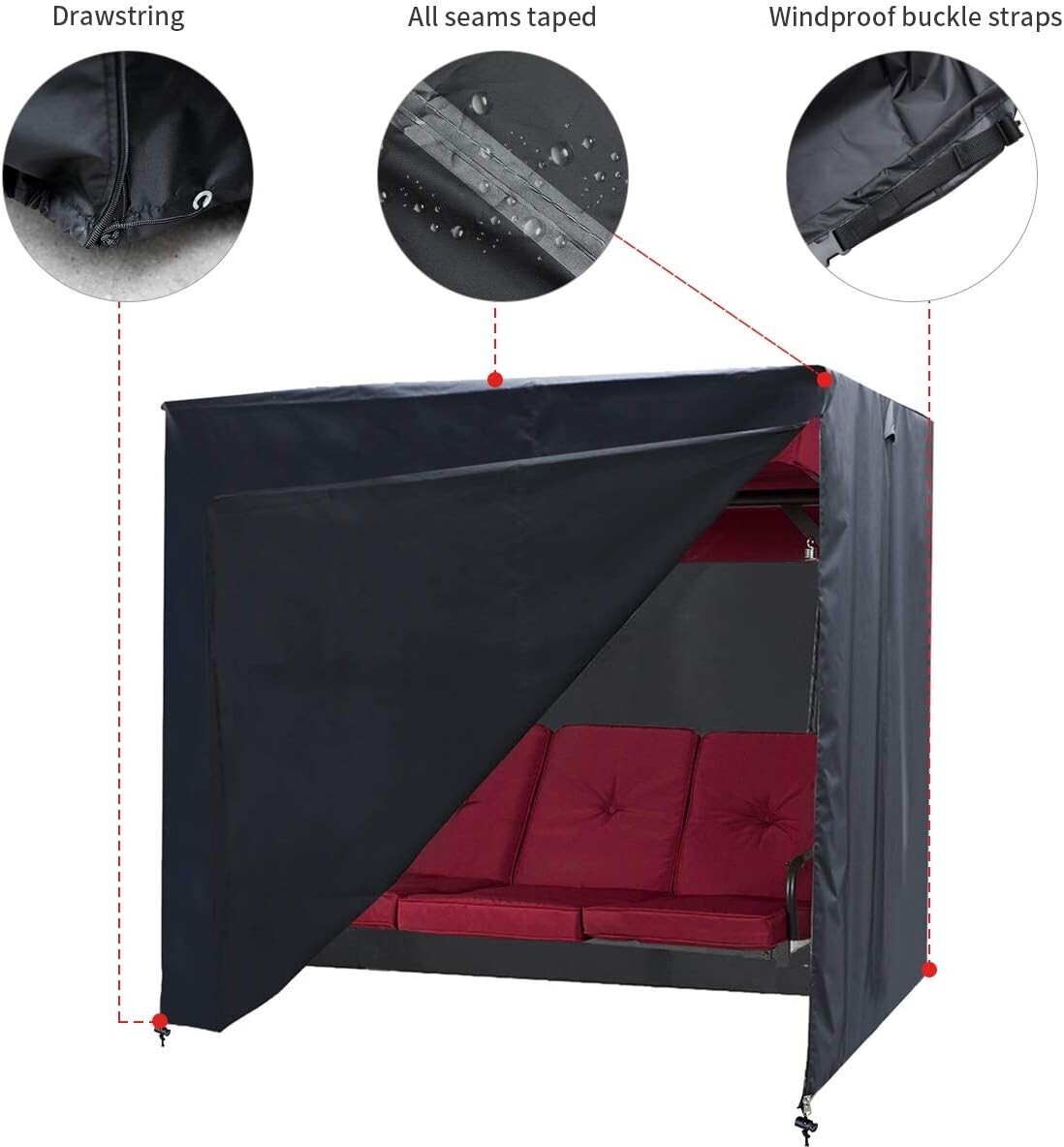 ?Swing Cover Design?With double-stitched seam, adding strength and swing cover are features 2 front zips, 2 drawstrings, 1 belt and 4 buckles for a secure custom fit with exceptional security in the windiest conditions, better prevent the swing chair cover from blowing away in the strong wind, don't worry about stability.