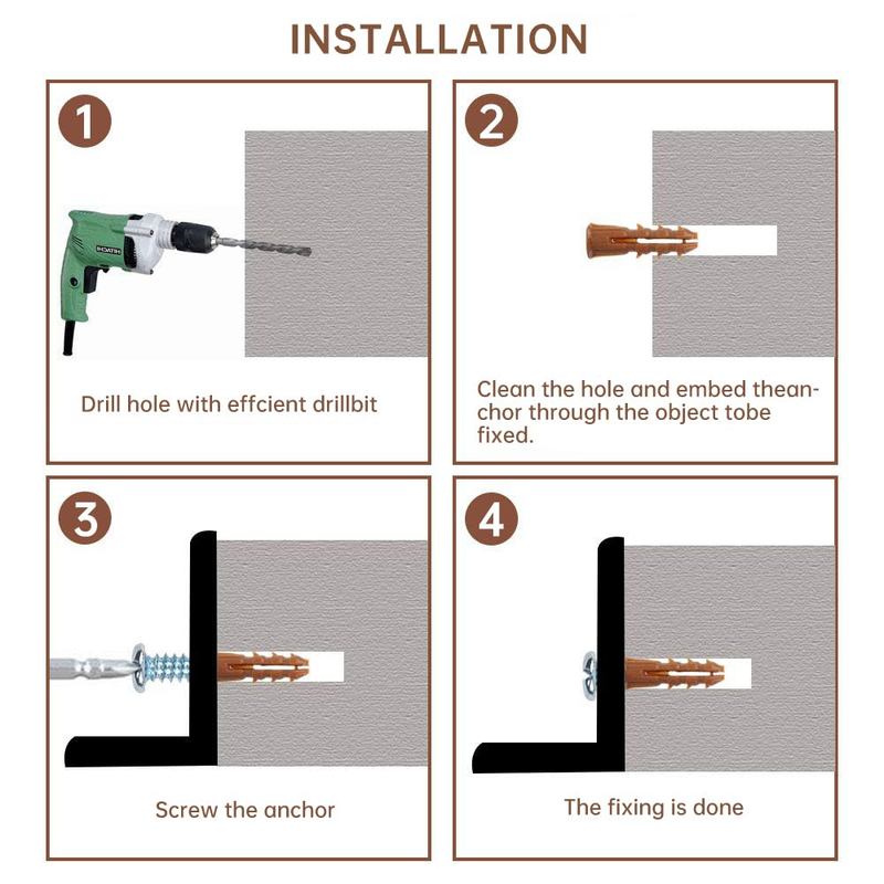 1.Drill hole with efficient drill-bit 2.Clean the hole and embed the anchor through the object to be fixed 3.Screw the anchor 4.The fixing is done