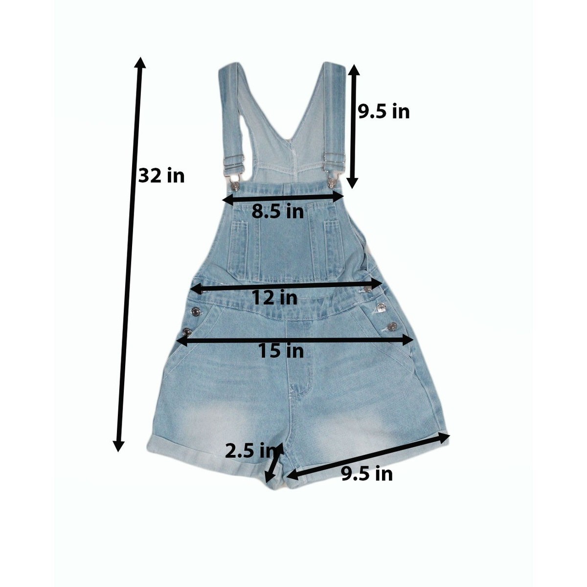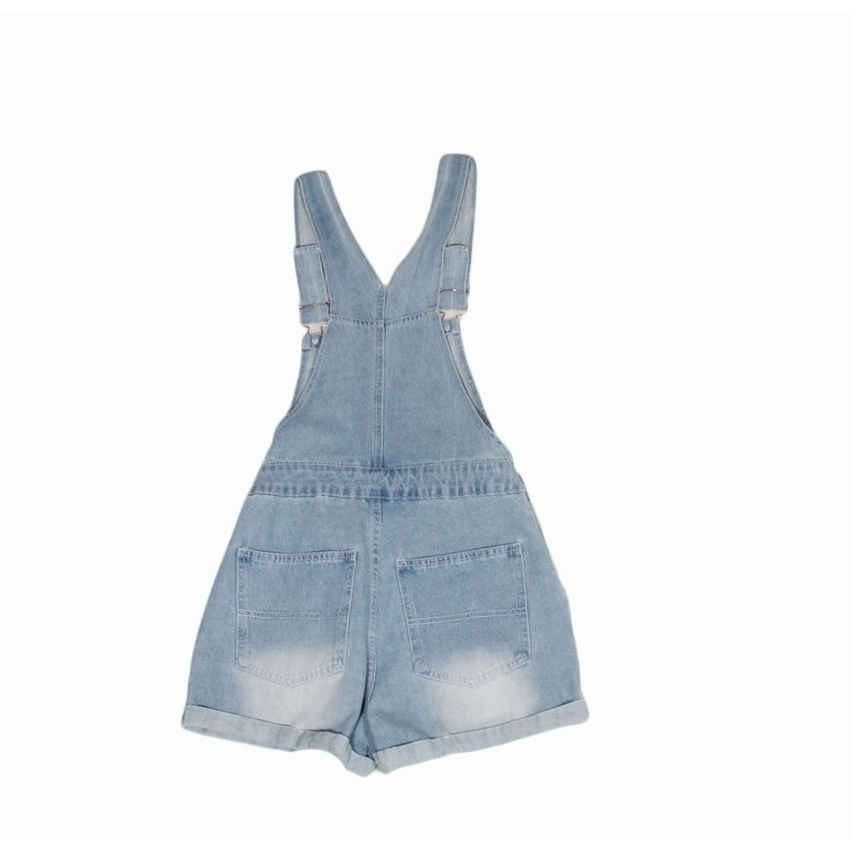 Step out in carefree style with these charming light wash denim shortalls. The cuffed rolled hem adds a touch of playful flair, perfect for showcasing your favorite sneakers. Adjustable straps ensure a comfortable and customized fit, while the classic five-pocket styling offers practicality. Distressed detailing on the pockets and hem adds a touch of vintage appeal.