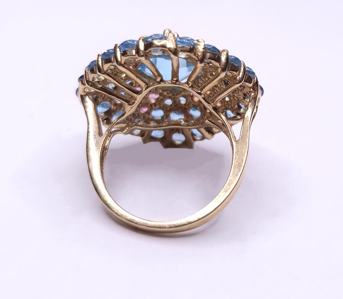 Material 14K Yellow Gold Condition: Pre- Owned Center Topaz: 5ct Total Stone:9.5ct Ring Dimensions: Size: 6 Ring Face: 25.2mm x 23.3mm Base Of Shank: 2.1mm Thickness: 1.1mm Comes with a generic box. Retail Price:$4,900
