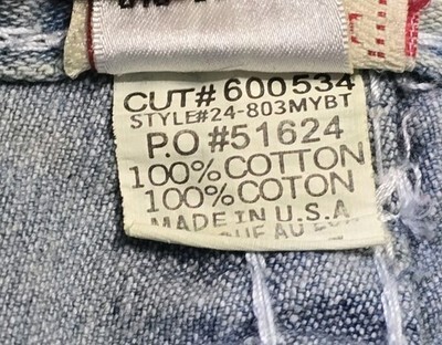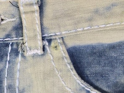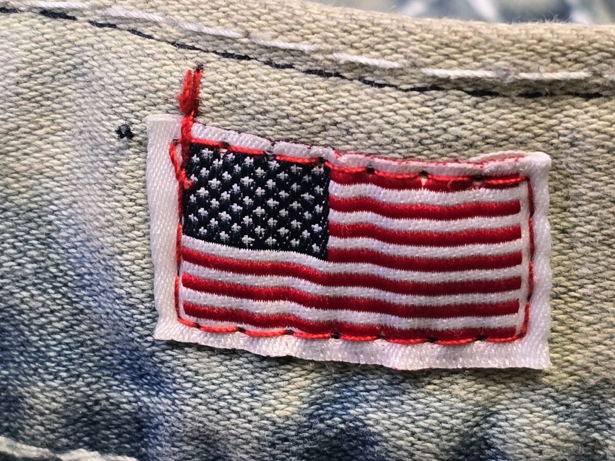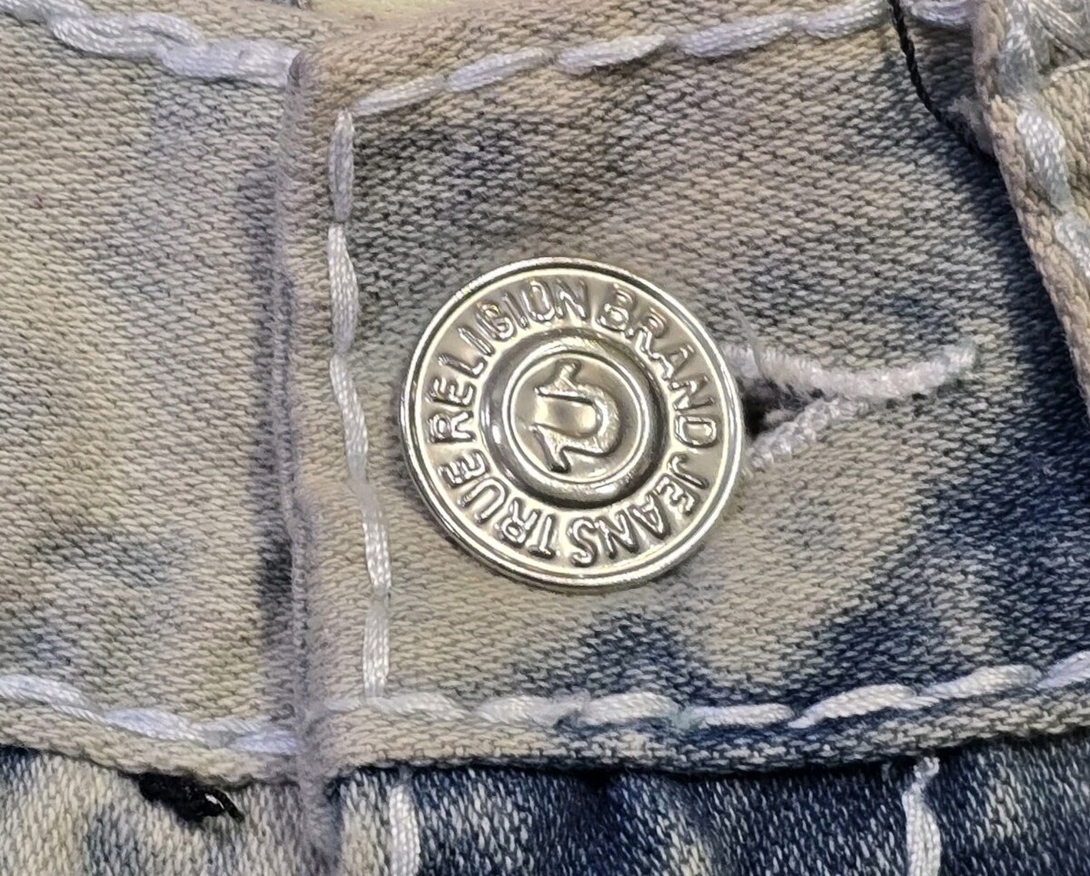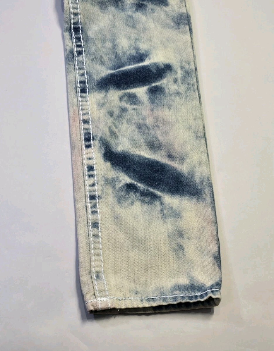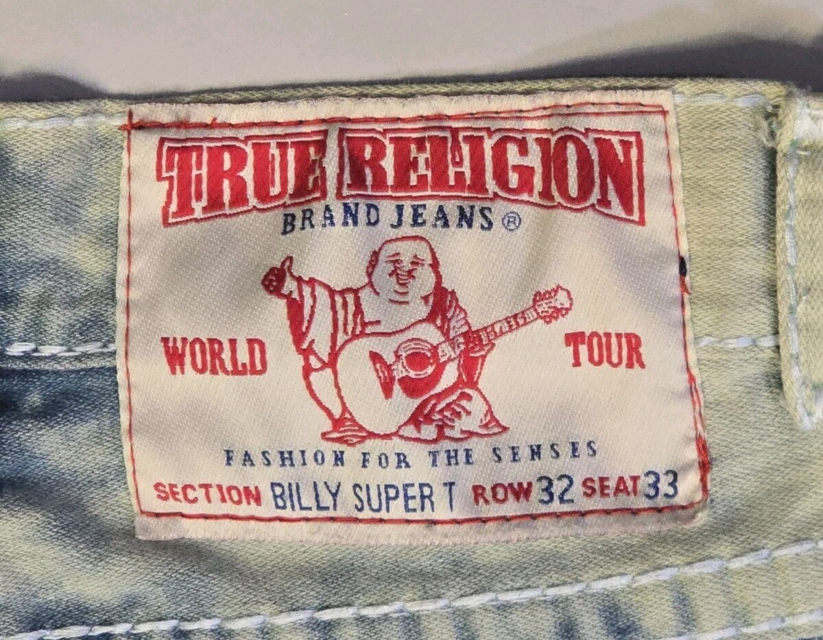 Please see photos 3 and 4 showing front and back of left leg with red dye stains. Photo five shows hole at top of left front pocket. The VTG TRUE RELIGION BILLY SUPER T Big Stitch Denim Jeans are a vintage pair of men's jeans made in the USA by True Religion. They feature a mid-rise, straight fit with a zip and button closure. These jeans are made of 100% cotton denim and have a tie-dye pattern with accents like buttons, a 5-pocket design, and a breathable fabric for comfort. With a size 32 waist and a 32-inch inseam, these jeans are perfect for all seasons and showcase a retro USA-themed style with a rock vibe. The True Religion Billy model is part of the World Tour line, adding a touch of logo flair to the classic denim design.