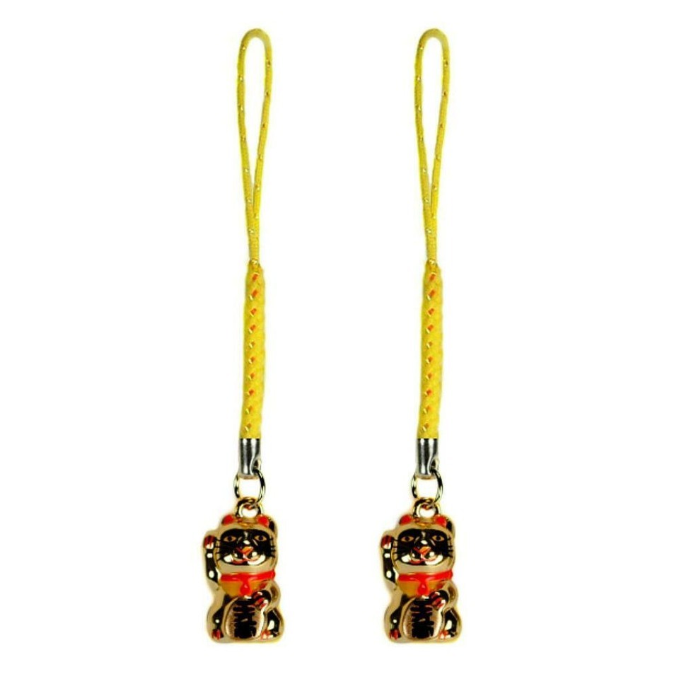 SET OF 2 LUCKY GOLD CAT BELL CHARM Beckoning Kitty Maneki Neko Brass Phone Strap