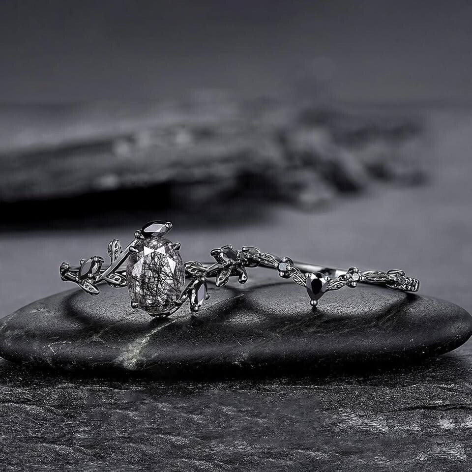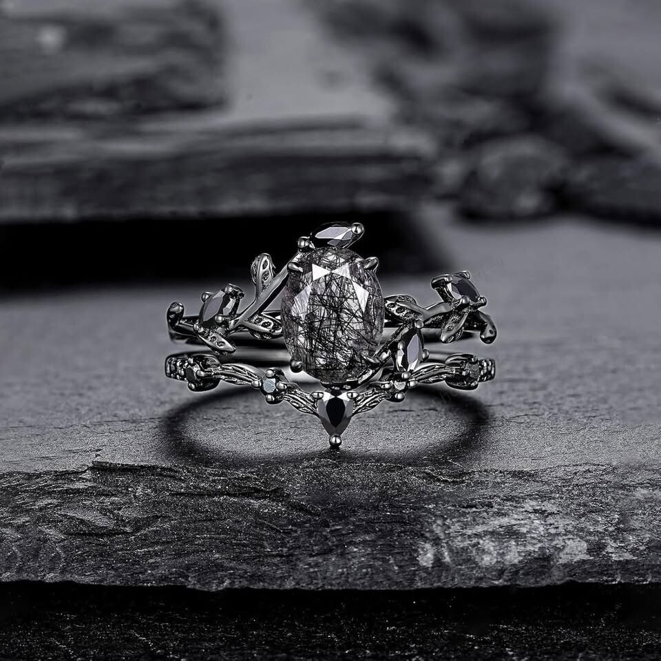 Natural Black Rutilated Quartz Ring Sets for Women