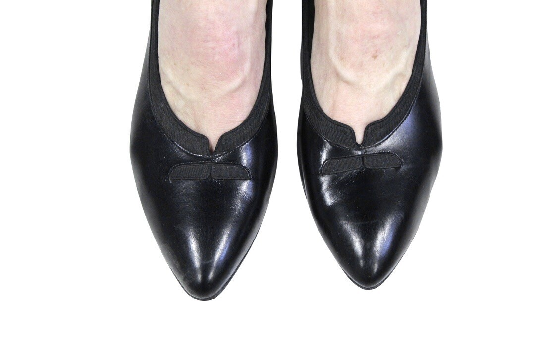 Vtg Enna Jetticks Black Leather Women's Shoes Pumps 10.5 A/AAA Med Heel NWOB 60s- the soles haven't been touched. Nice black smooth leather with pointed toe and curved 2 3/4" heel. Nice vamp details.