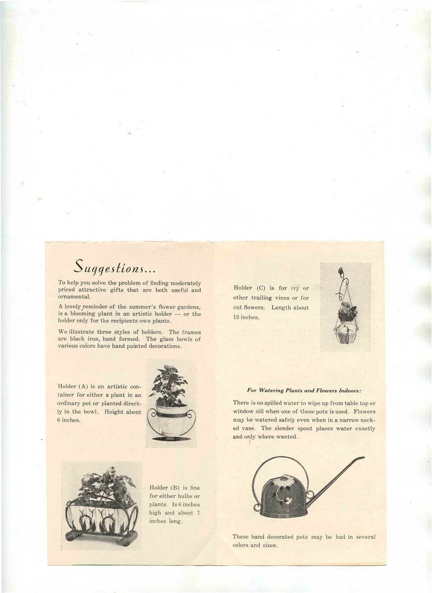 A well illustrated 4 page brochure. Bright Spots on Your Christmas List Brochure, circa late 1930's. with Flower Holders, Pots, Animal Figures, Candle Holders and more. Merchants could buy these brochures with their names on them and send them to theri customers.