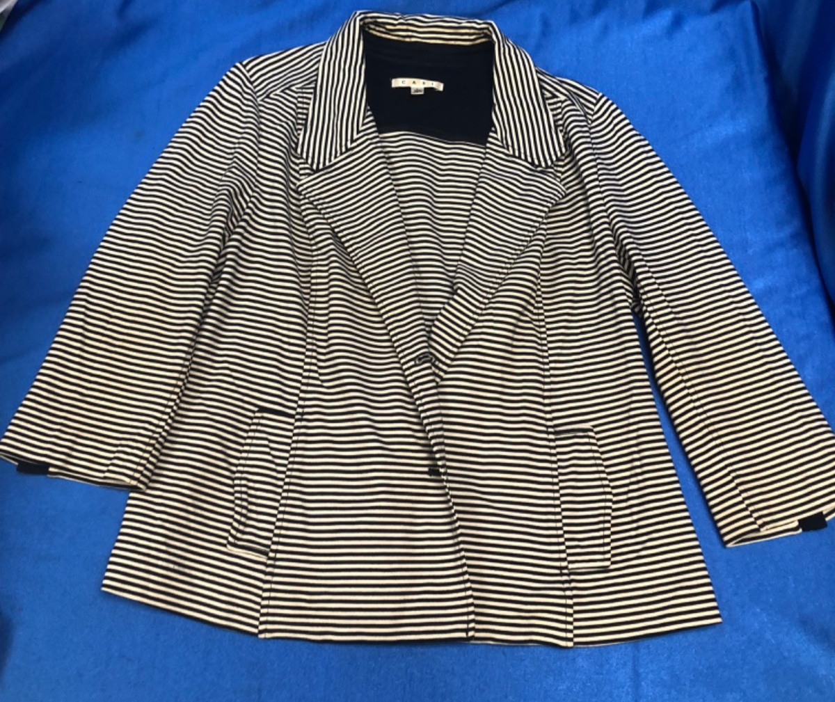 This classic CAbi blazer offers a perfect blend of professional structure and knit comfort. Featuring a timeless nautical-inspired striped pattern, a single-button closure, and 3/4 length sleeves, it is ideal for business-casual office wear or layering over a summer dress.
