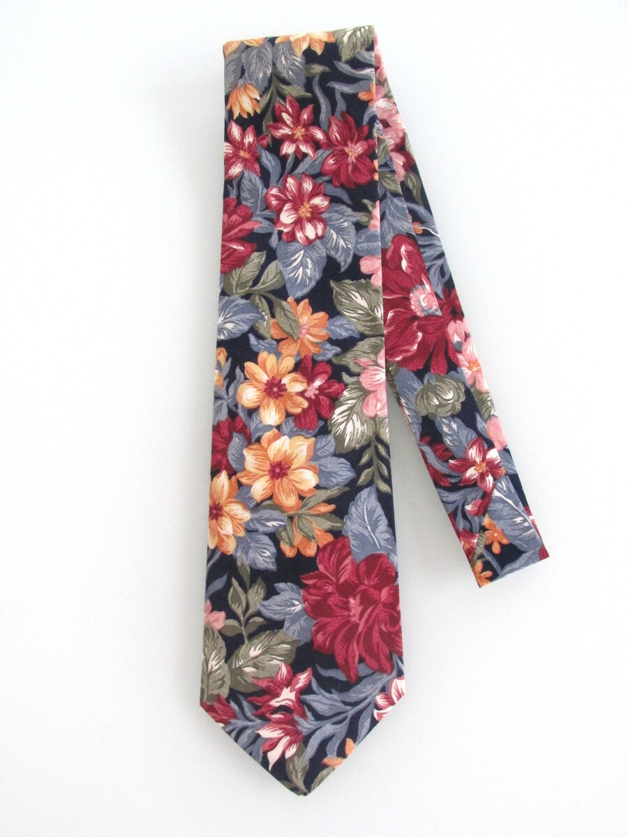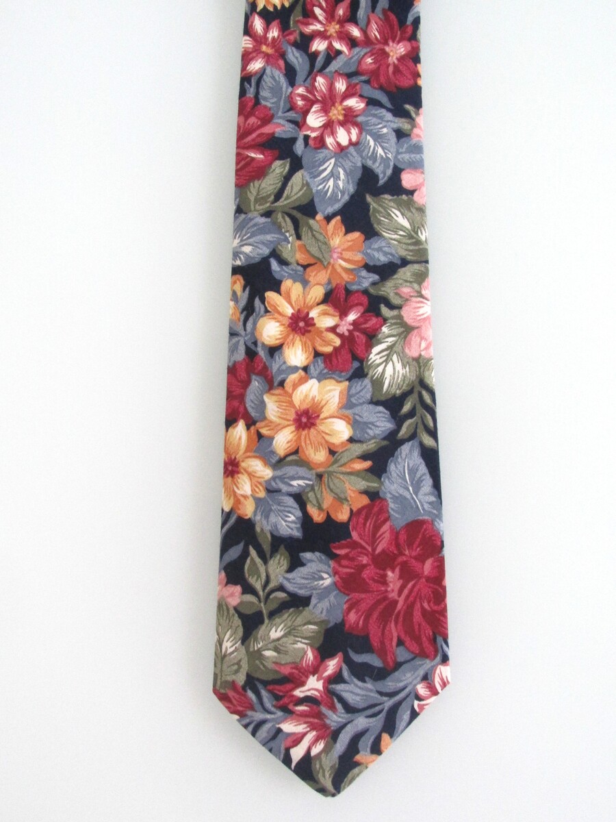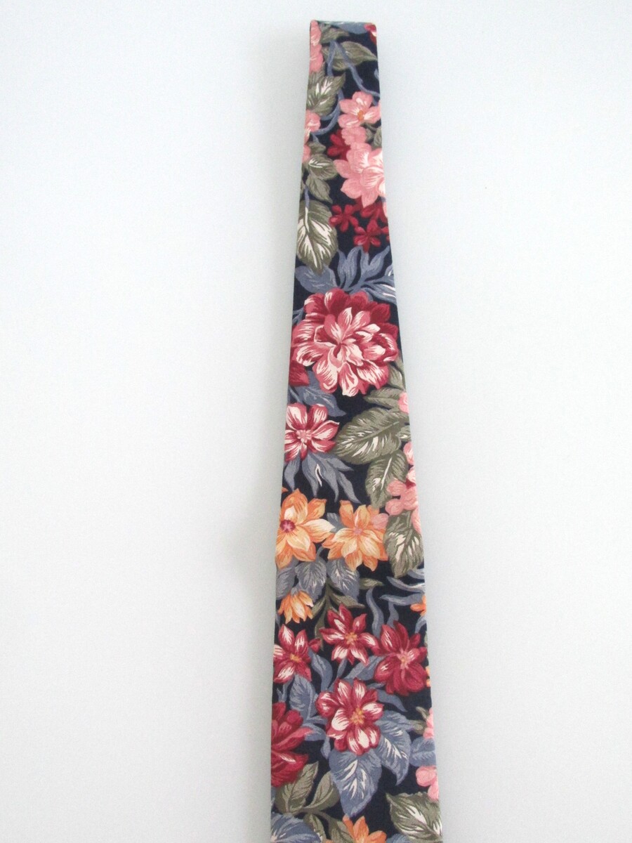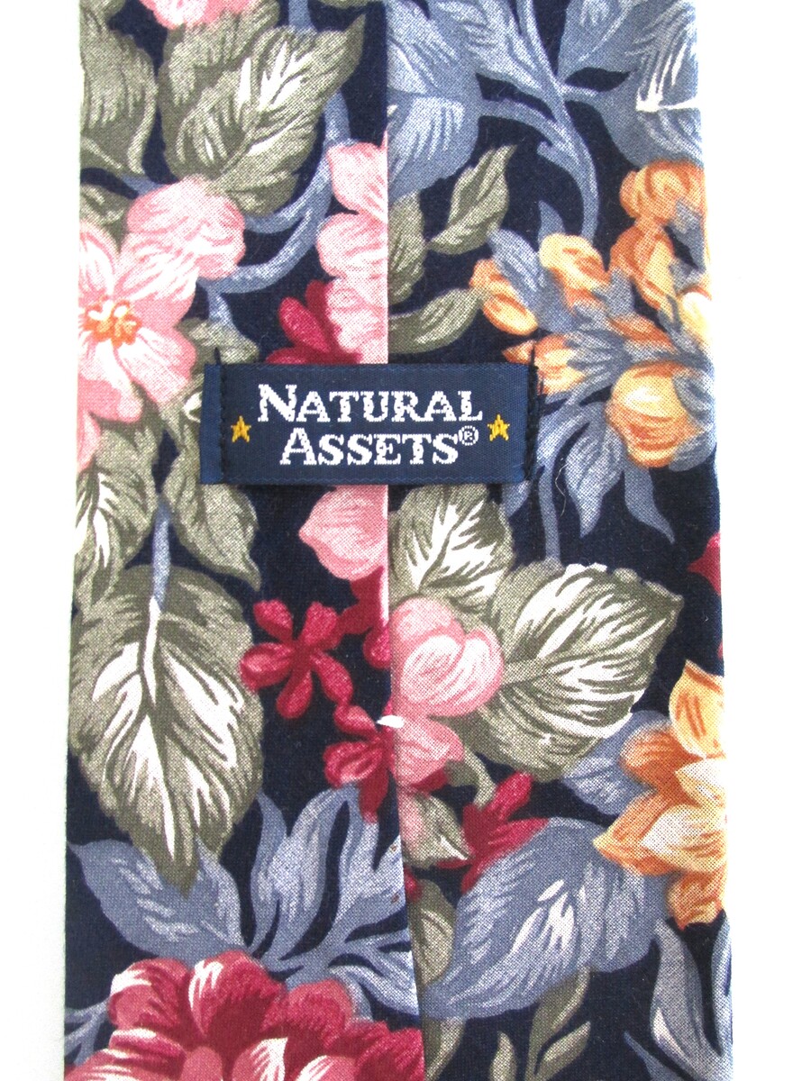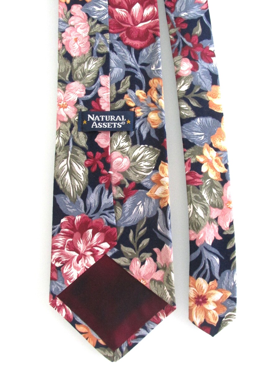 Description: Up for sale is a Natural Assets (NWOT) vintage men's cotton floral tie. The tie is handmade in the USA of 100% cotton. The tie has a multicolored floral pattern in rose, pink, yellow, coral, blue and green on a black background. Dimensions are approximately 55" long x 4.00" wide.