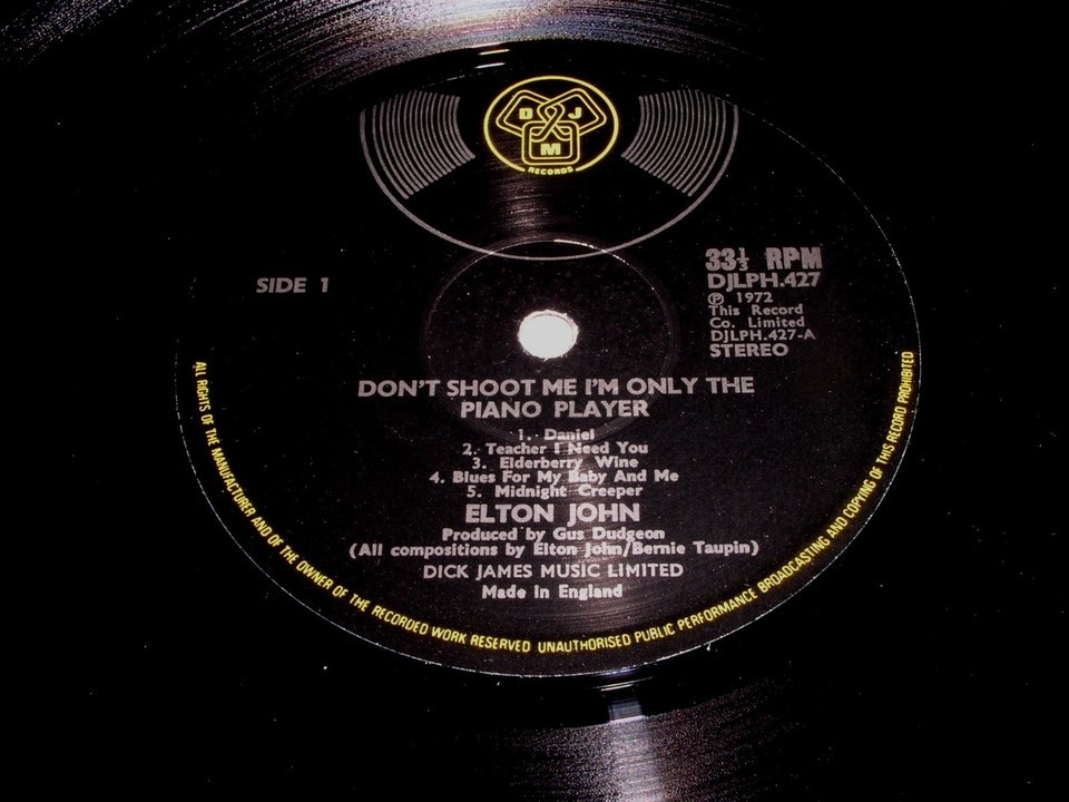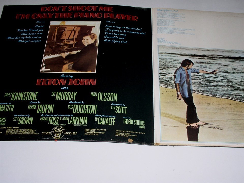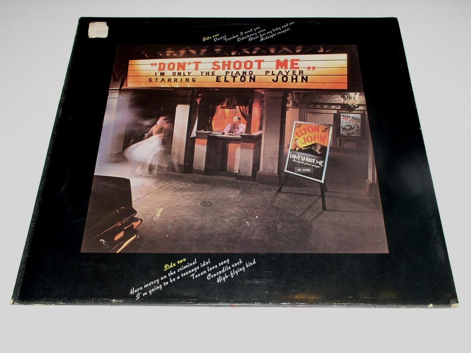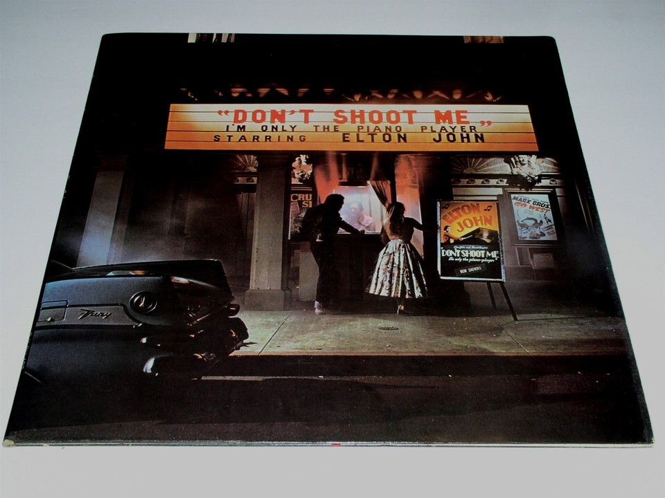 This is a UK import record album for Elton John's, "Don't Shoot Me, I'm Only the Piano Player". Record label DJM 427. Glossy cover, not as the American issue. The cover is a single pocket with no lyric sheet. Nostalgic record store sticker on the back as shown.