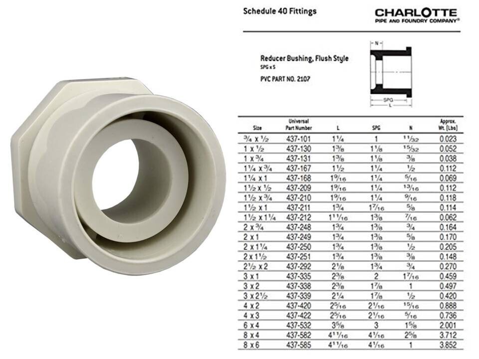 PVC Schedule 40 fitting that is for pressure systems where temperatures will not exceed 140 F. They are highly resilient, with high-tensile and high-impact strength. PVC Schedule 40 has better sound deadening qualities than PVC Schedule 40 DWV Foam Core and ABS Foam Core. Installation requires the use of primer and solvent cement. All Charlotte Pipe products are manufactured in the USA. *