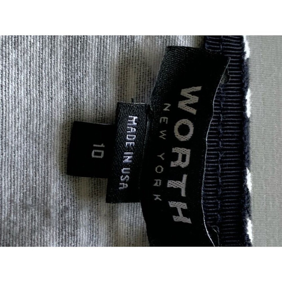 This WORTH skirt is a size 10, straight and pencil style, designed for women. It features a short length and a geometric pattern in black. Made from a blend of cotton and elastic, the knit fabric offers stretch for comfort. Suitable for casual occasions, it is appropriate for all seasons. The skirt is manufactured in the USA and requires dry cleaning. It is pre-owned. Keywords: WORTH, skirt, size 10, black, geometric, cotton, elastic, knit, stretch, casual, women's fashion, USA, pre-owned.