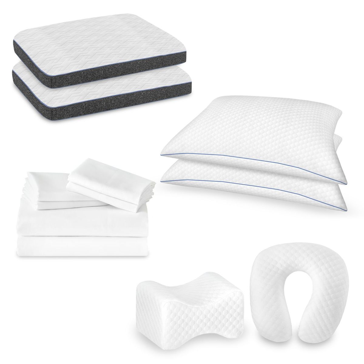 Product 12-Piece Premium Comfort Bedding Pack''Upgrade your sleep experience with this 12-piece luxury bedding pack, thoughtfully designed for superior comfort and support. Whether you're looking for plush relaxation, targeted support, or high-quality bedding essentials, this set has everything you need for a restful night's sleep.ftftWhat's Included:''? (2) Gusseted Memory Foam Pillows (Queen Size) ? Designed for optimal neck and head support with a structured gusset for added loft.''? (2) Shredded Foam Jumbo Pillows (18ft x 28ft) ? Plush and breathable, offering a soft yet supportive feel.''? Contour Knee Pillow ? Ideal for side sleepers, promoting proper spinal alignment and reducing pressure on joints.''? Molded Foam Bolster Pillow ? Versatile support for the neck, back, or legs, perfect for relaxation and pain relief.''? Six-piece 300TC Cotton Sheet Set (Includes 4 Pillowcases) ? Luxuriously soft and breathable, made from 300-thread-count cotton for a smooth, cool feel.''Transform your bed into a sleep sanctuary with this 12-piece premium bedding setโbecause better sleep starts with better bedding!