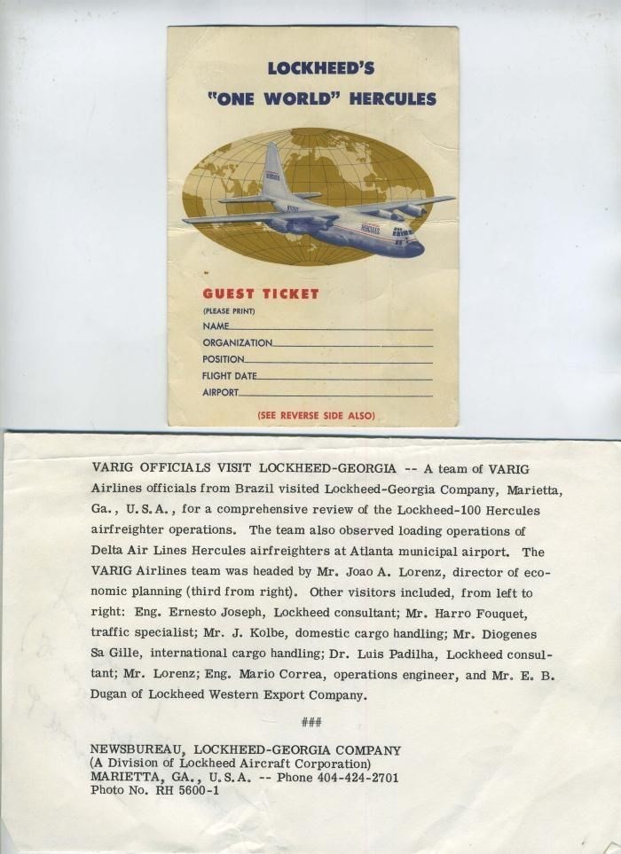 An 8" x 10" black and white photograph of Varig Airlines officials from Brazil visiting the Lockheed Georgia plant in Marietta, Georgia for a comprehensive review of the Lockheed-100 Hercules airfreighter operations. There is information on the back about the visit and the visitors. Plus a guest ticket for Lockheed's One World Hercules flight. All in very good condition. the Lockheed 100 Hercules is the civilian version of the Military C-130.