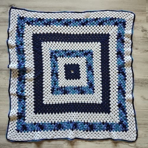 Granny Square Crochet Afghan Blanket Vintage Handmade Throw Blue Knitted 45"x46"