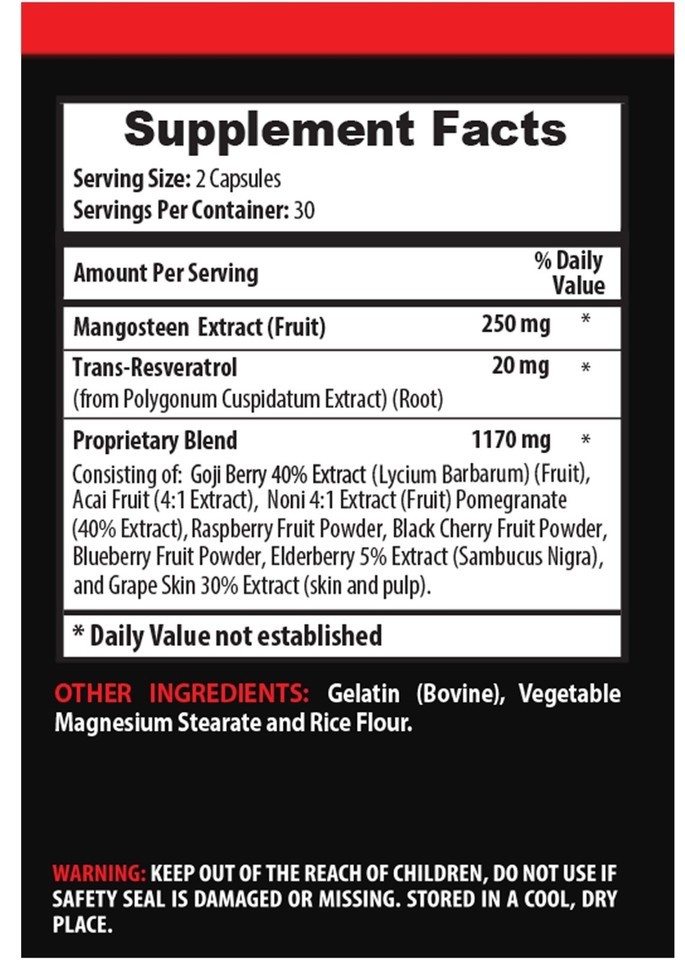 Introducing our MANGOSTEEN COMPLEX ? a meticulously crafted blend of potent superfoods designed to enhance overall well-being and vitality. This exceptional health supplement features key ingredients such as Mangosteen, Acai Berry, Goji Berry, Noni, Pomegranate, trans-Resveratrol, and a Proprietary Blend comprising Raspberry, Black Cherry, Blueberry, Elderberry, and Grape Skin. Explore the remarkable benefits each component brings to this comprehensive formula.