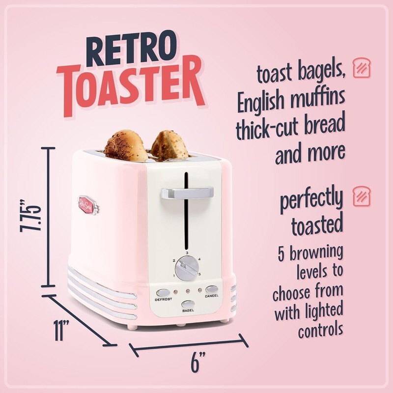 Retro Wide 2-Slice Toaster, Vintage Design with Crumb Tray, Pink