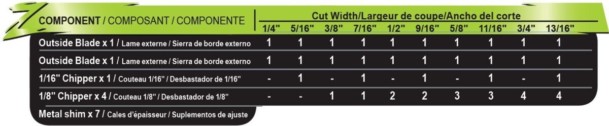 Set includes two 8" outer blades, five two-wing chippers and seven metal shims for fine adjustments
