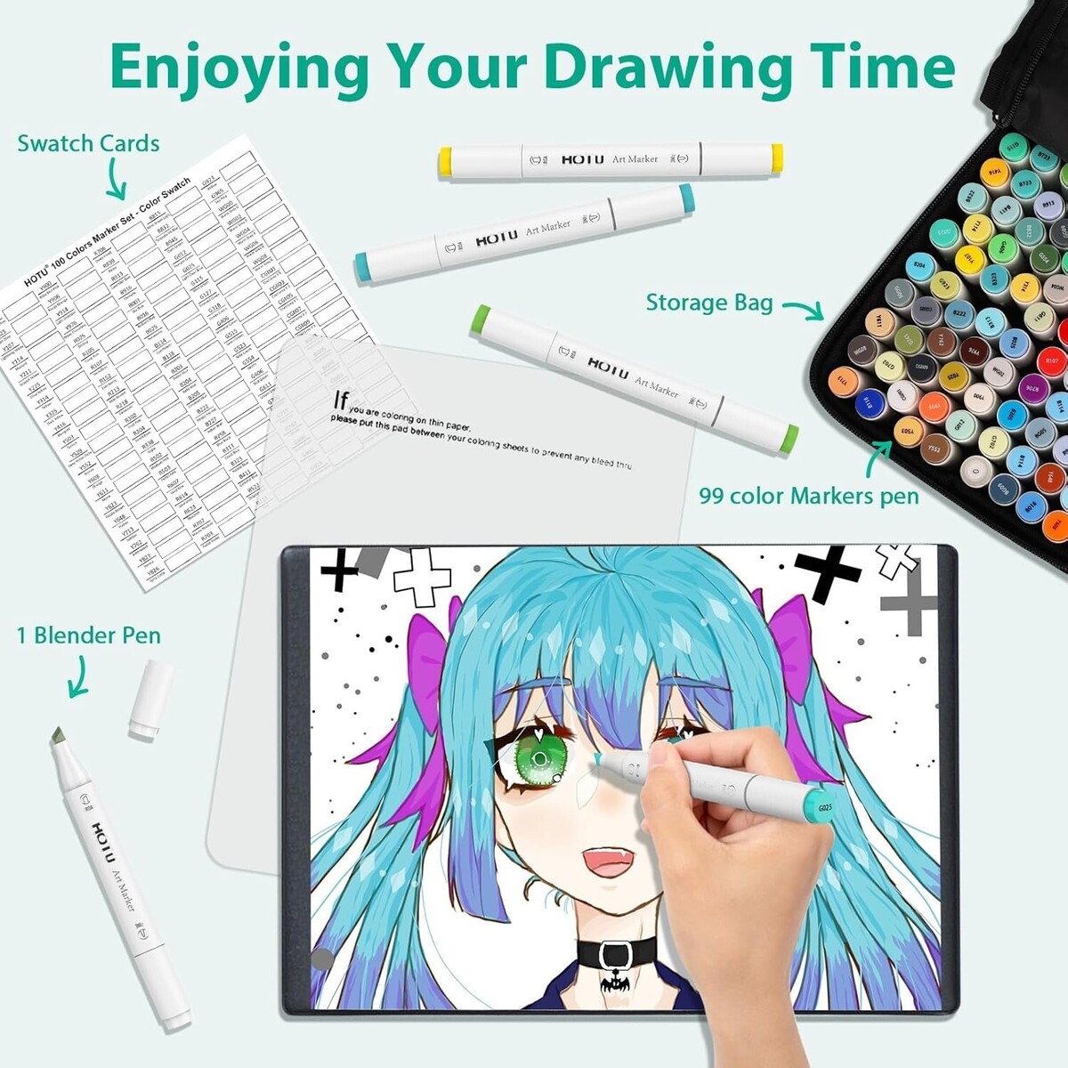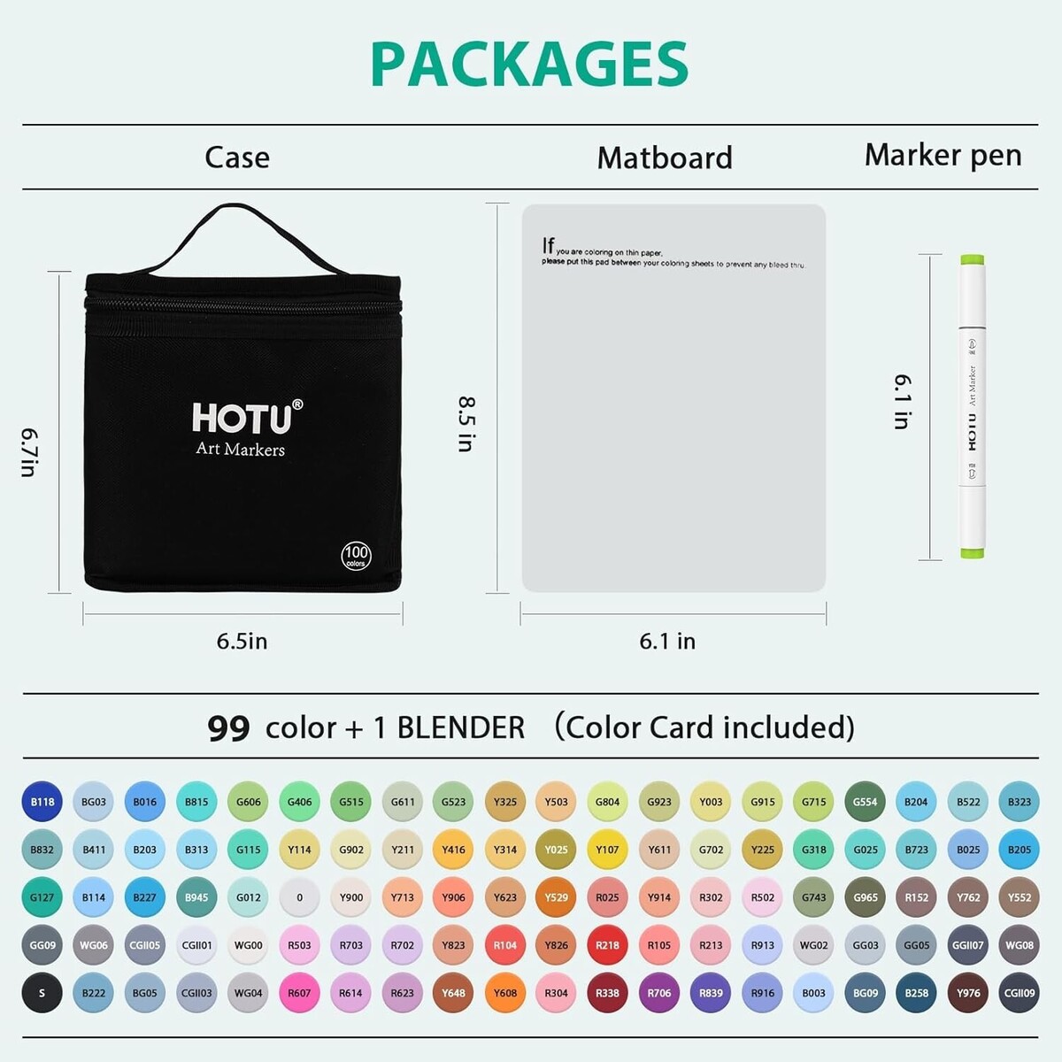 PACKAGING: Alcohol Markers contains 99 Colors + 1 Colorless Blender Dual Tip Marker Pen; Quadruple storage pouch; 1 Plastic mat to prevent ink bleed-through; Color sample cards. Please check the package before you use it