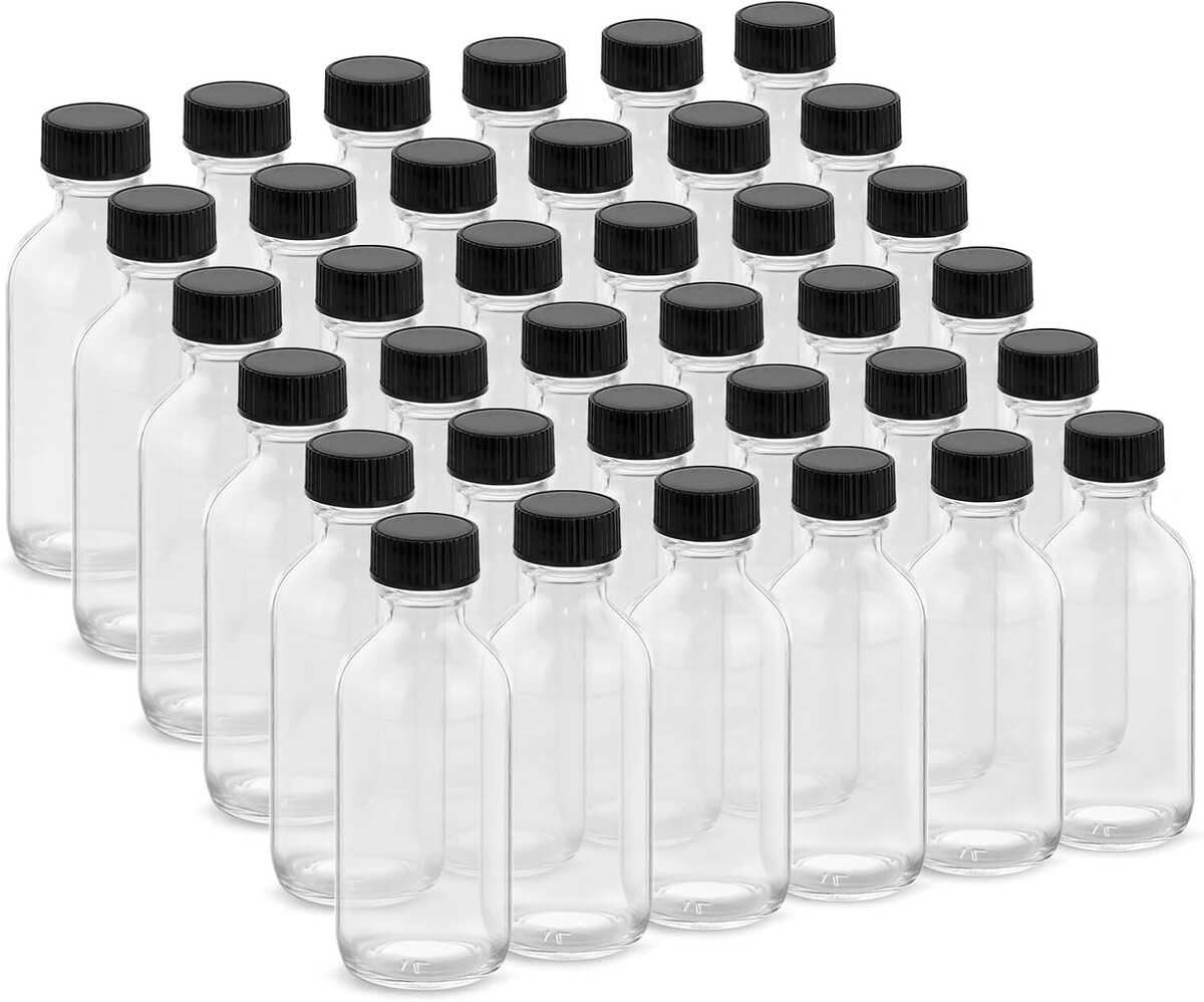 Package Include: 36 pack 2oz clear glass bottles, 6 funnels and 36 caps. Each bottle has a bubble cotton barrier next to it to prevent it from crashing into each other during transportation.
