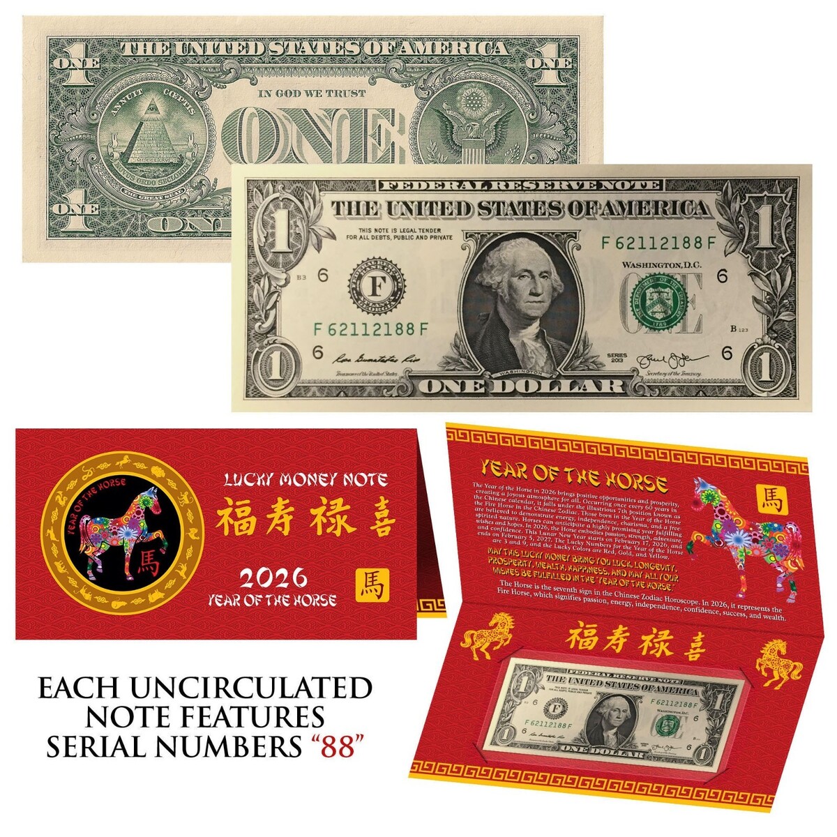 In celebration of the 2026 Year of the Horse Chinese Lunar New Year, we have announced the newest addition to its Lucky Money Collection?2026 Year of the Horse Lucky 8?s Serial Number Banknotes. The Year of the Horse 2026 product is designed with Decorative Chinese Symbolism and packaged in a Symbolic Red Folder adorned in Full-Color. Each folder contains an uncirculated Genuine Legal Tender United States Banknote. This features an uncirculated $1 Federal Reserve note with serial numbers containing the numbers ?88.