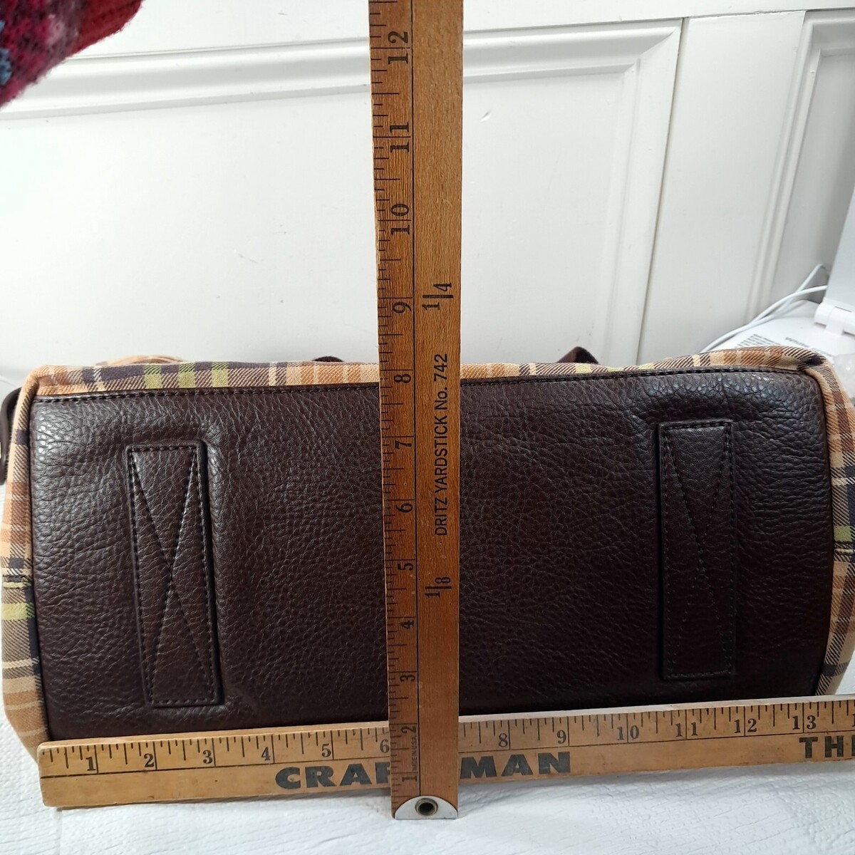 Large embroidered logo crest on brown/neutral plaid and camel corduroy. MISSING THE TAB TO CLOSE THE TOTE, AS SHOWN. Can be used as an open top tote as shown. See all pics. Tote is in very good condition.
