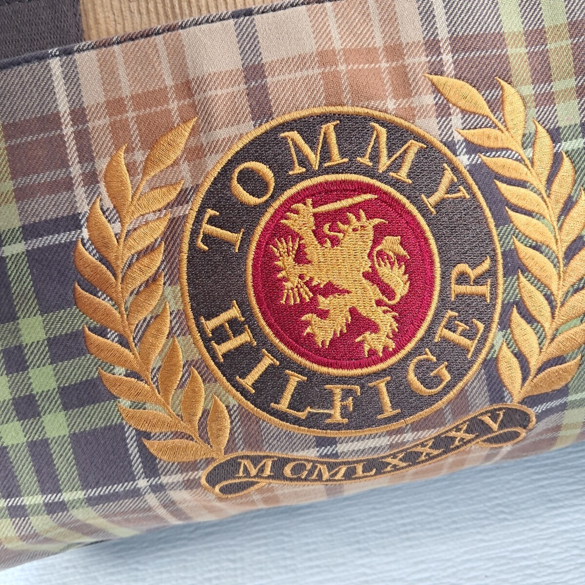 Vintage Tommy Hilfiger Tote Purse MCMLXXXV Embroidered Lion Plaid Corduroy Bag