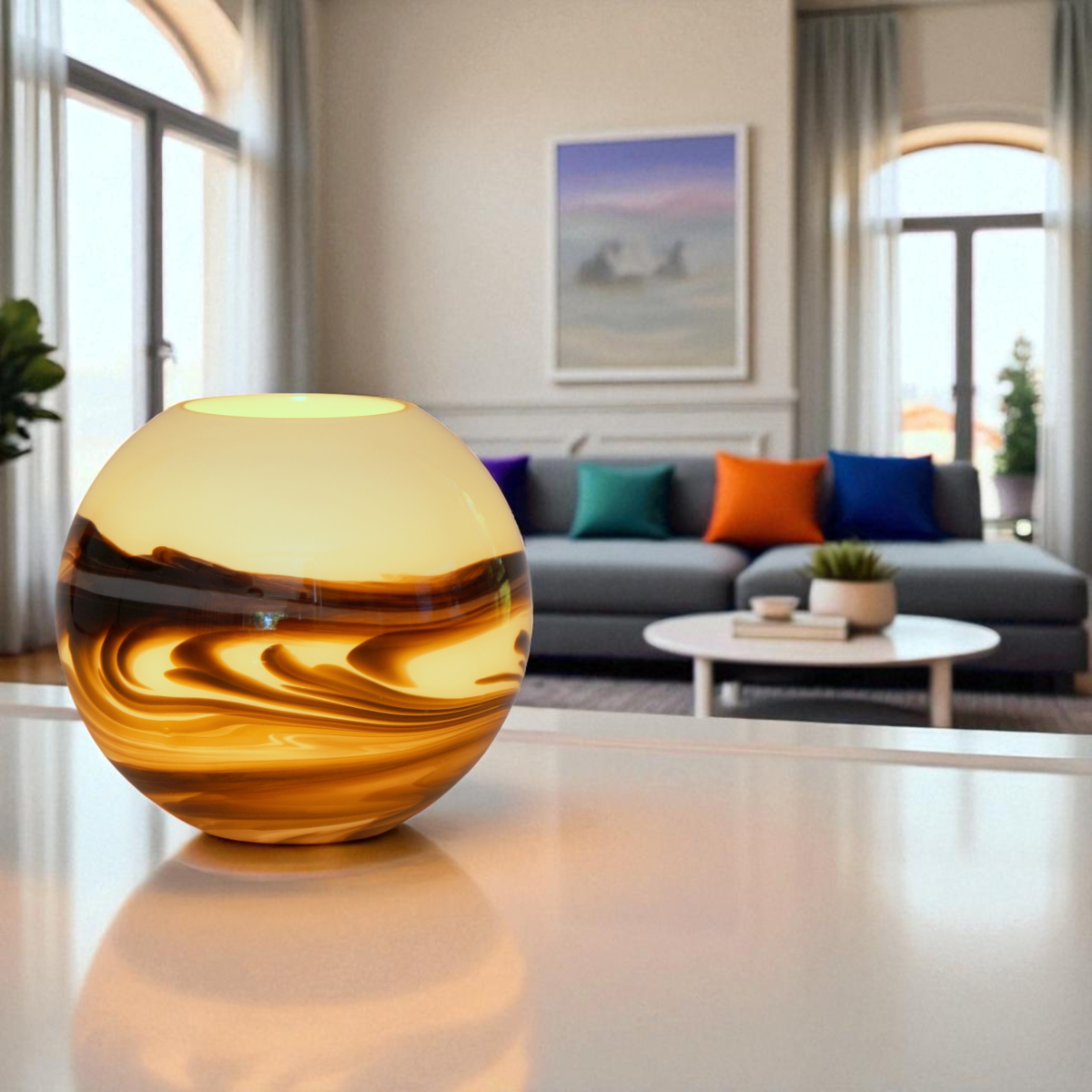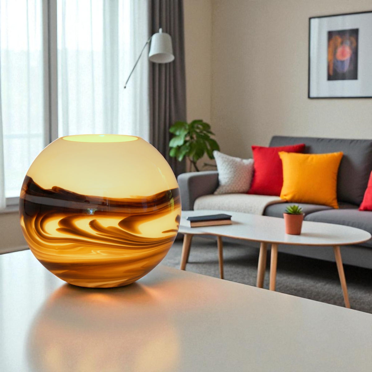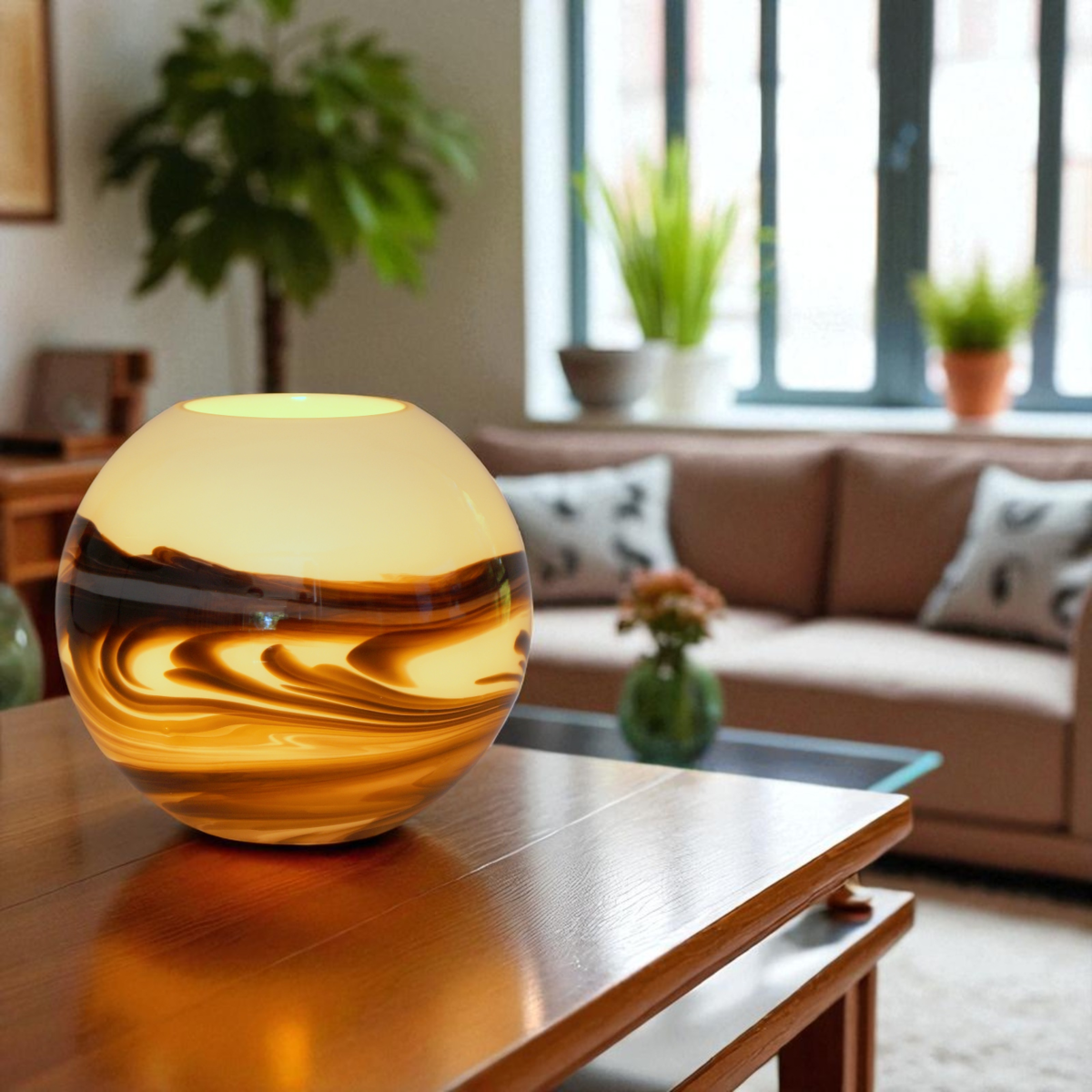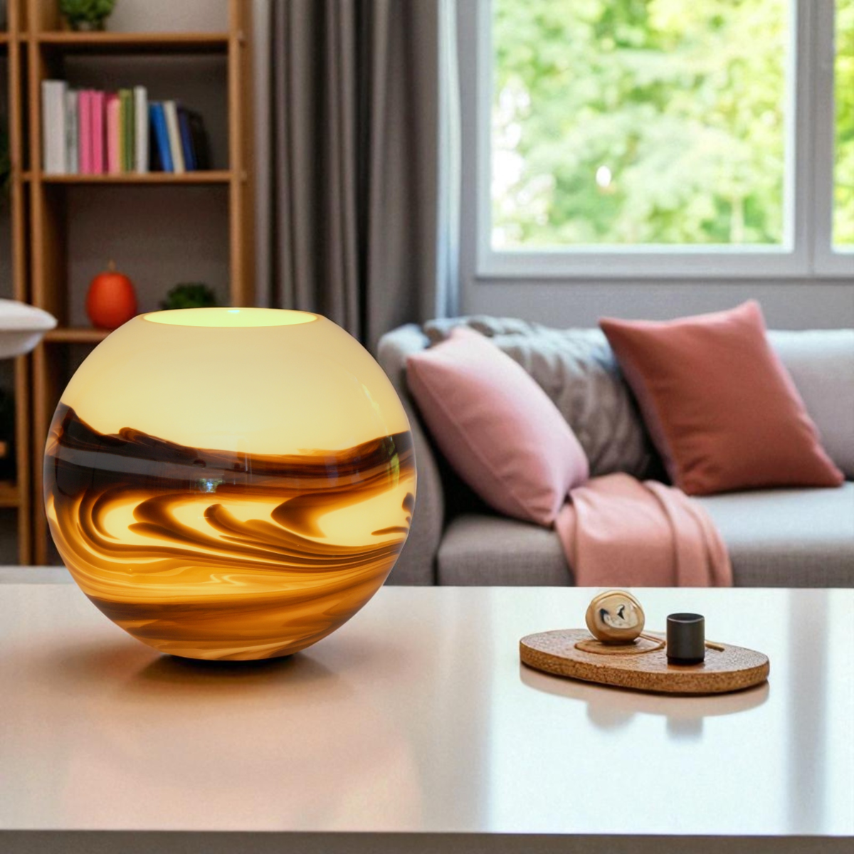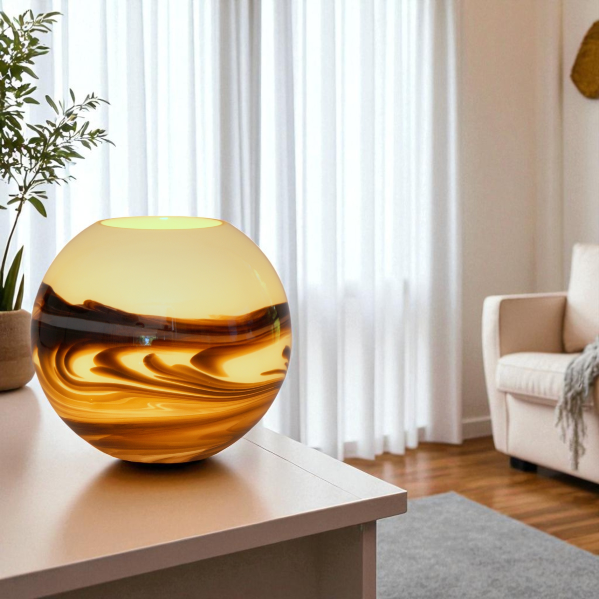 Le globe en verre souffle a la main (chacun unique !) presente un effet marbre chaleureux avec des tons blancs completes par de subtils tourbillons bruns et gris.